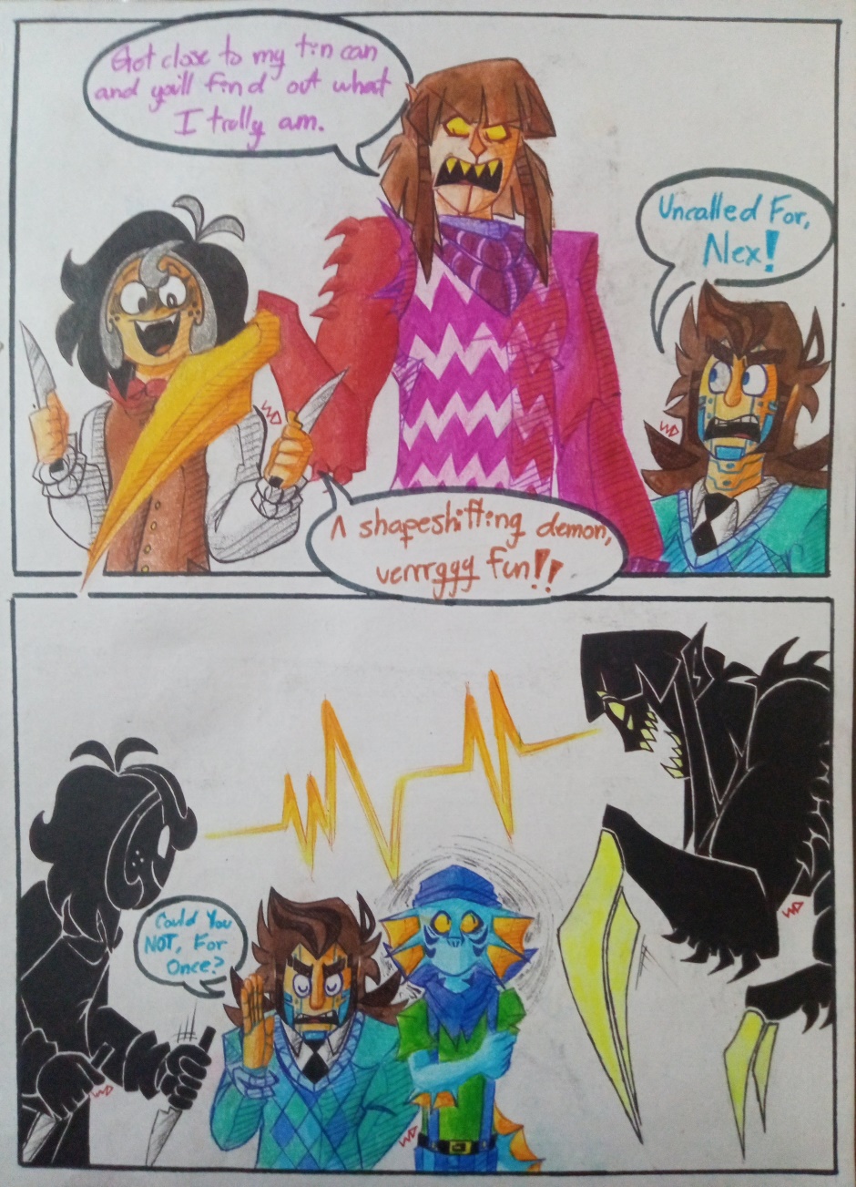 Text! I like the choice of turning his top into a hoodie, it's very cute! And then the reveal that Billy is. So short. Next to Alex. I had a good laugh, I'm sorry, it's just amazing. And then Denied's face at the end... He's so unsettled. He's starting to remember...