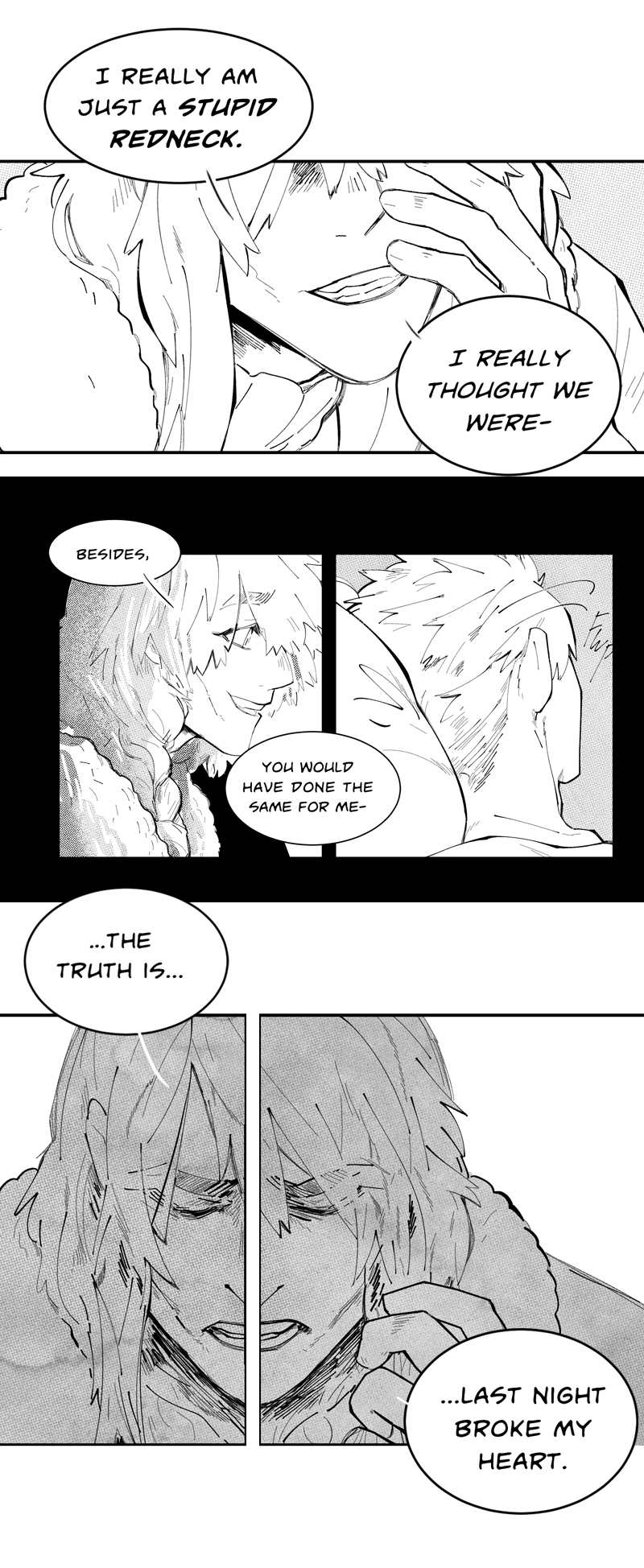 This was another potato chip scene for me. I'm sure there's like a real term for it, but one of those tasty scenes you have throughout your story that you look forward to reaching. Personal realizations, my beloved....coming to terms with your own faults, my beloved....Having to have a talking otter and a farm boy repeatedly hit you over the head until a thought leaks in, my beloved...