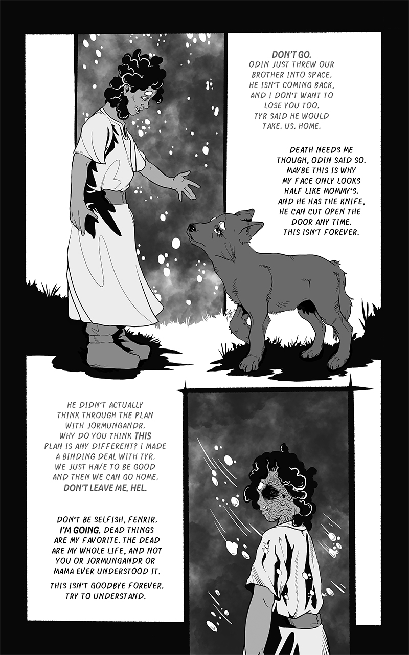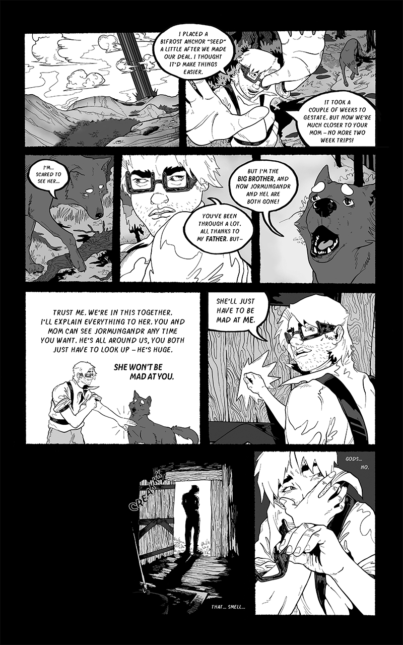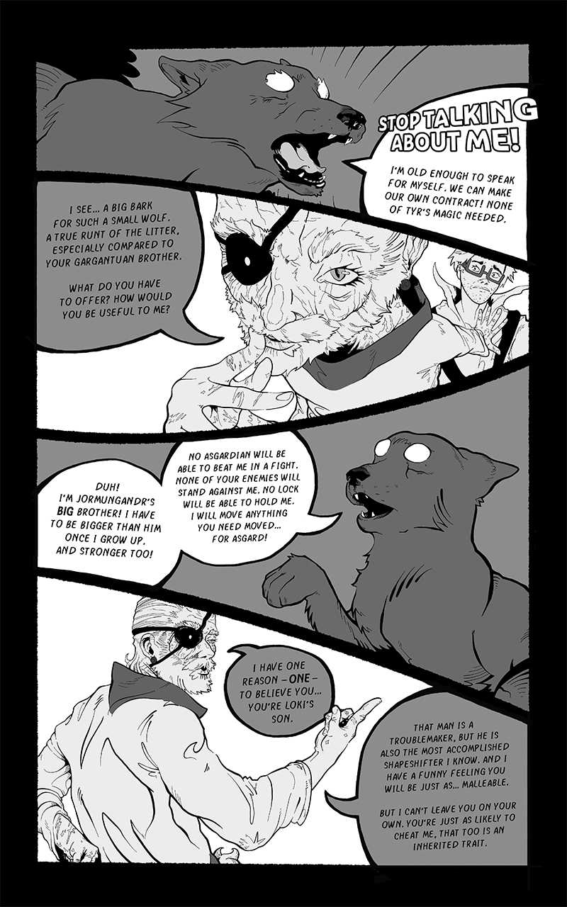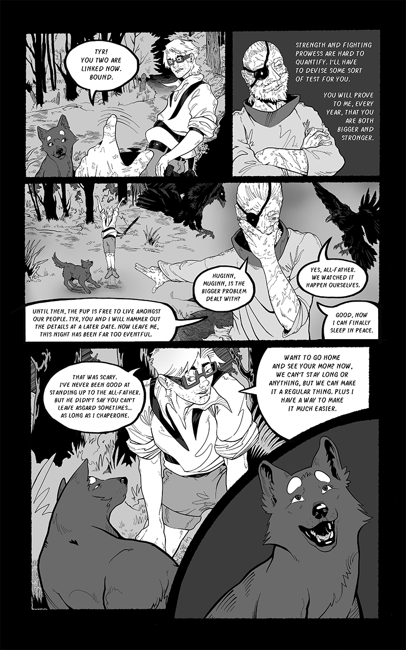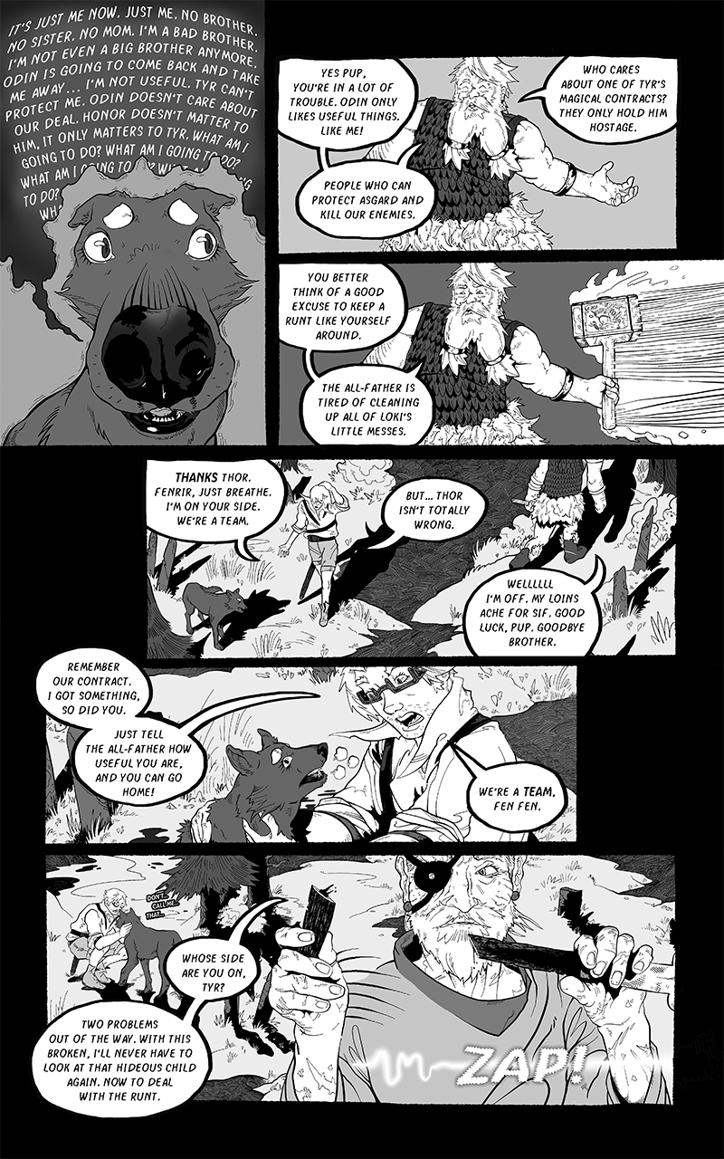 An ongoing webcomic chronicling Fenrir's journey across a barren, post-Ragnarok landscape. Hunted by the Norse Gods who desire vengeance he seeks to find his place in a future that is no longer pre-ordained.