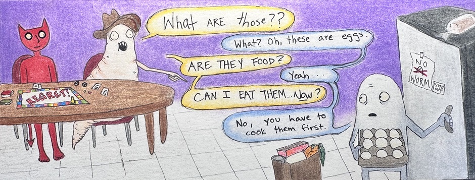 With two new mouths to feed, Jeffn is making more frequent grocery trips. The Worm sees an egg for the first time.