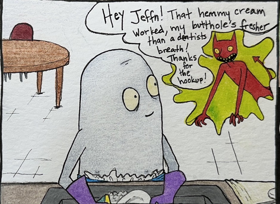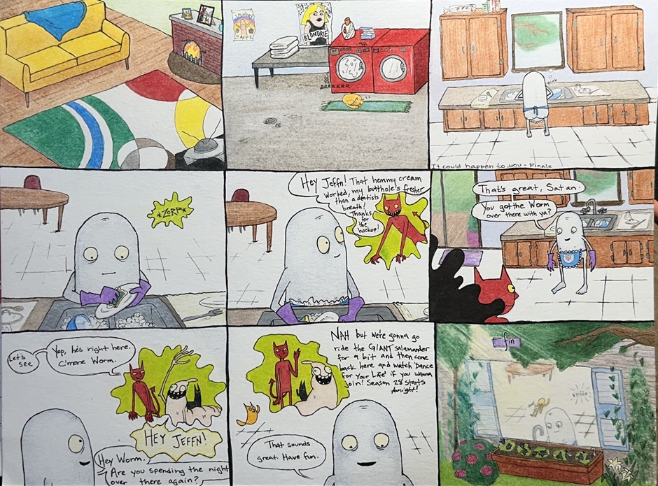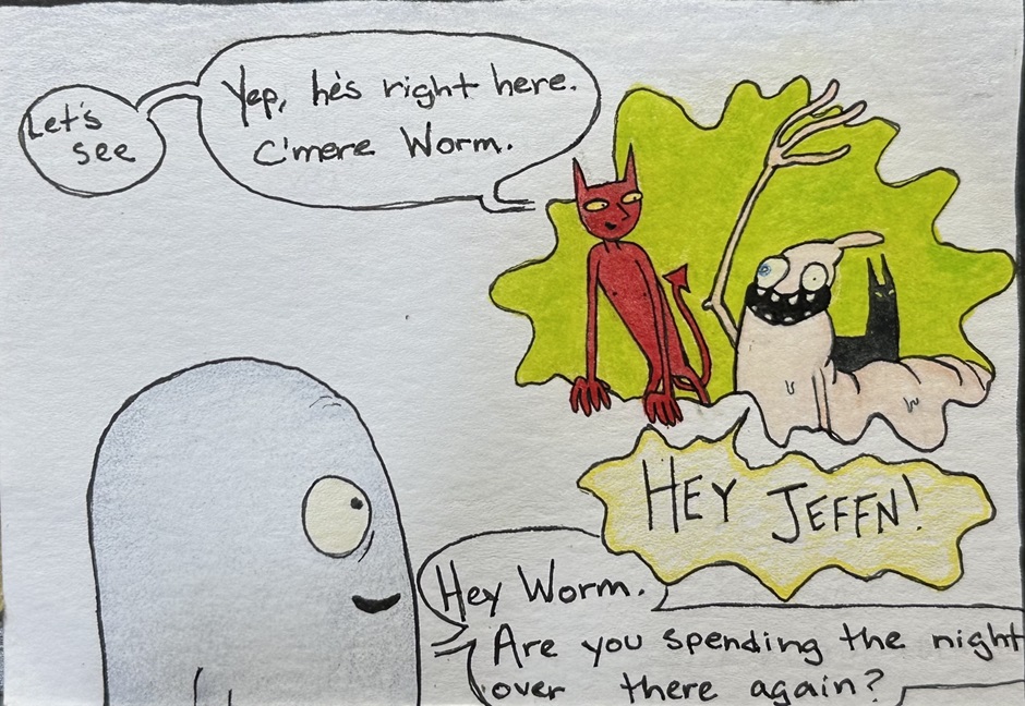 Jeffn (silent n) is just a normal guy hanging out in his living room when the unthinkable happens; he barfs up a food-crazed man-sized worm.