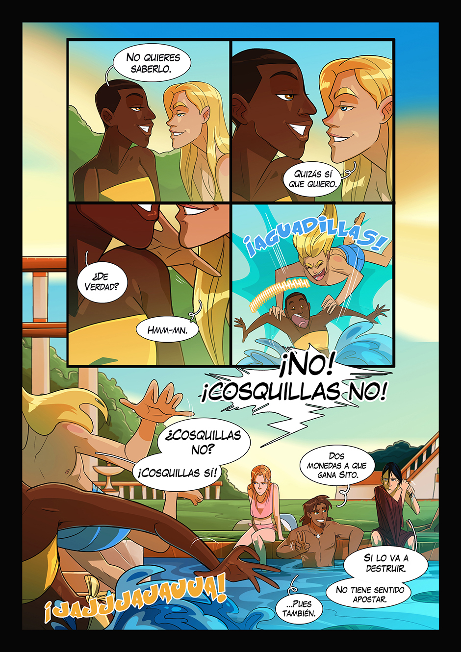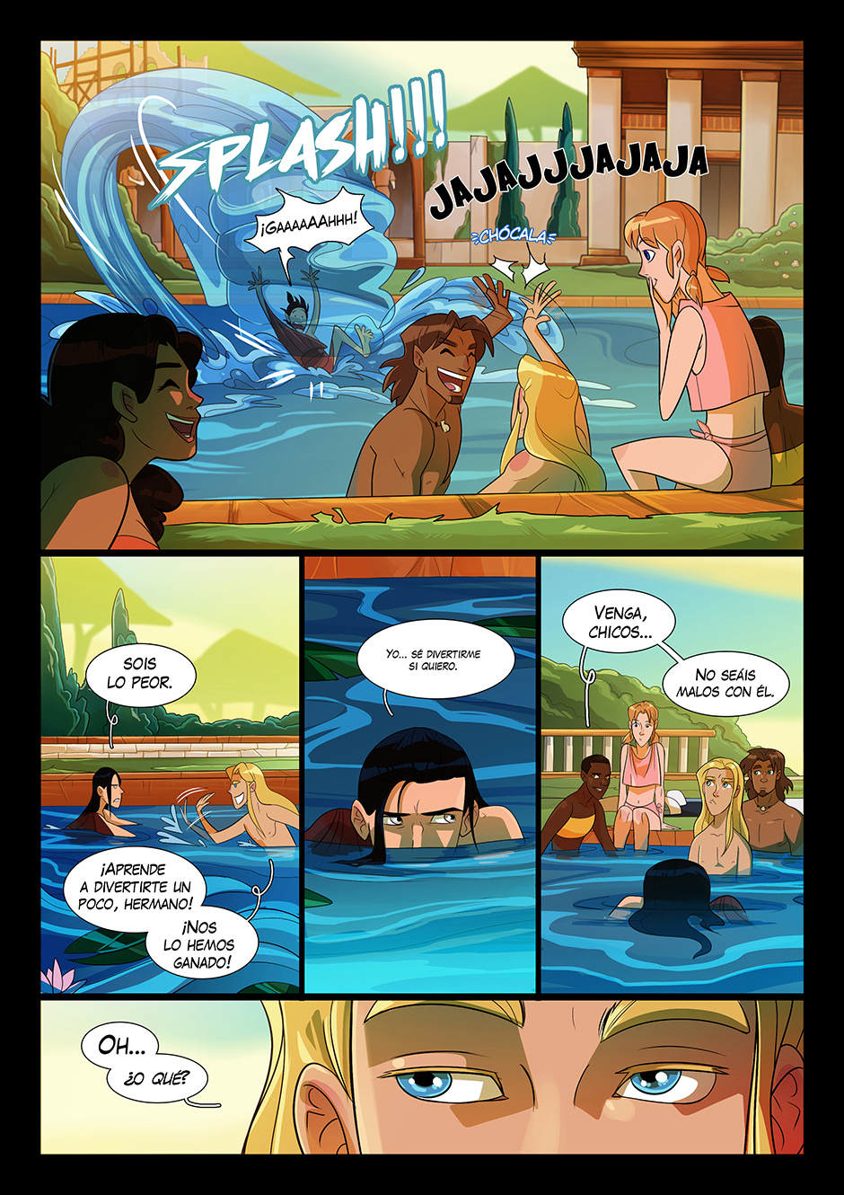Este es uno de mis capítulos favoritos y creo que da comienzo a toda la acción principal de la Parte I. Y de paso por fin tenemos un Capítulo de Piscina en plan anime 😂💕 Flats de Toñi Gil, que es una artistaza y está disponible para encargos y demás trabajos, id a seguirla y echarle un vistazo a su curro ➡️ blueberrymess.bsky.social