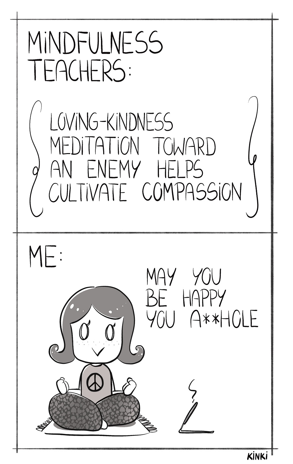 "Compassion Training" 🧘♂️🌿✨ Mindfulness? Easy. Meditation? Doable. Practicing compassion toward an enemy? Yeah... about that. 😅 Turns out, mindfulness meditation is great… until you have to practice compassion for someone who really tested your patience. 🤡🤷♂️ #KinkiComics #ComicSeries #Comics #CompassionTraining #Mindfulness #Meditation #CompassionTowardEnemy #LovingKindnessMeditation #ITriedMyBest #InnerPeaceButAtWhatCost