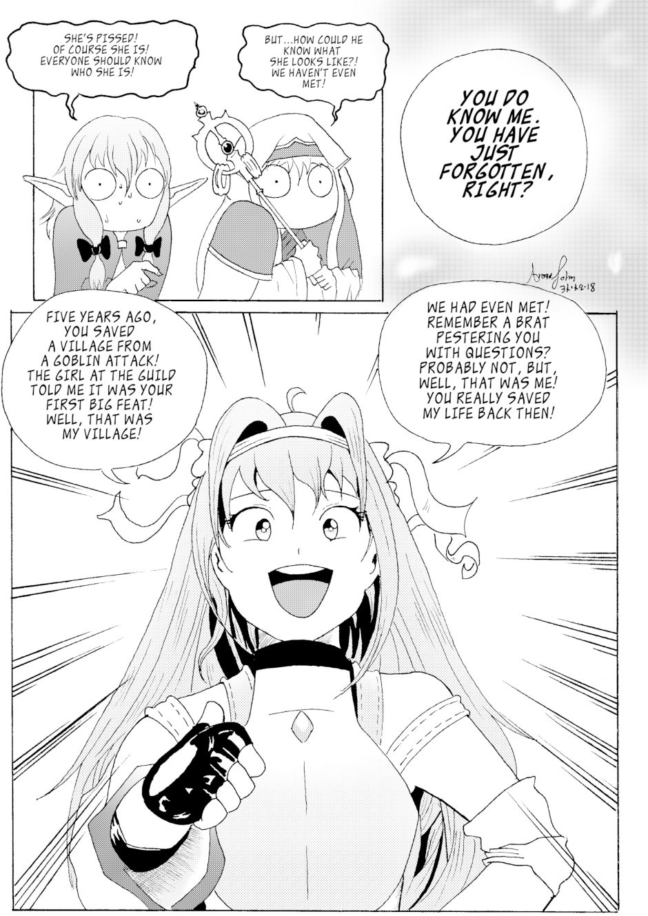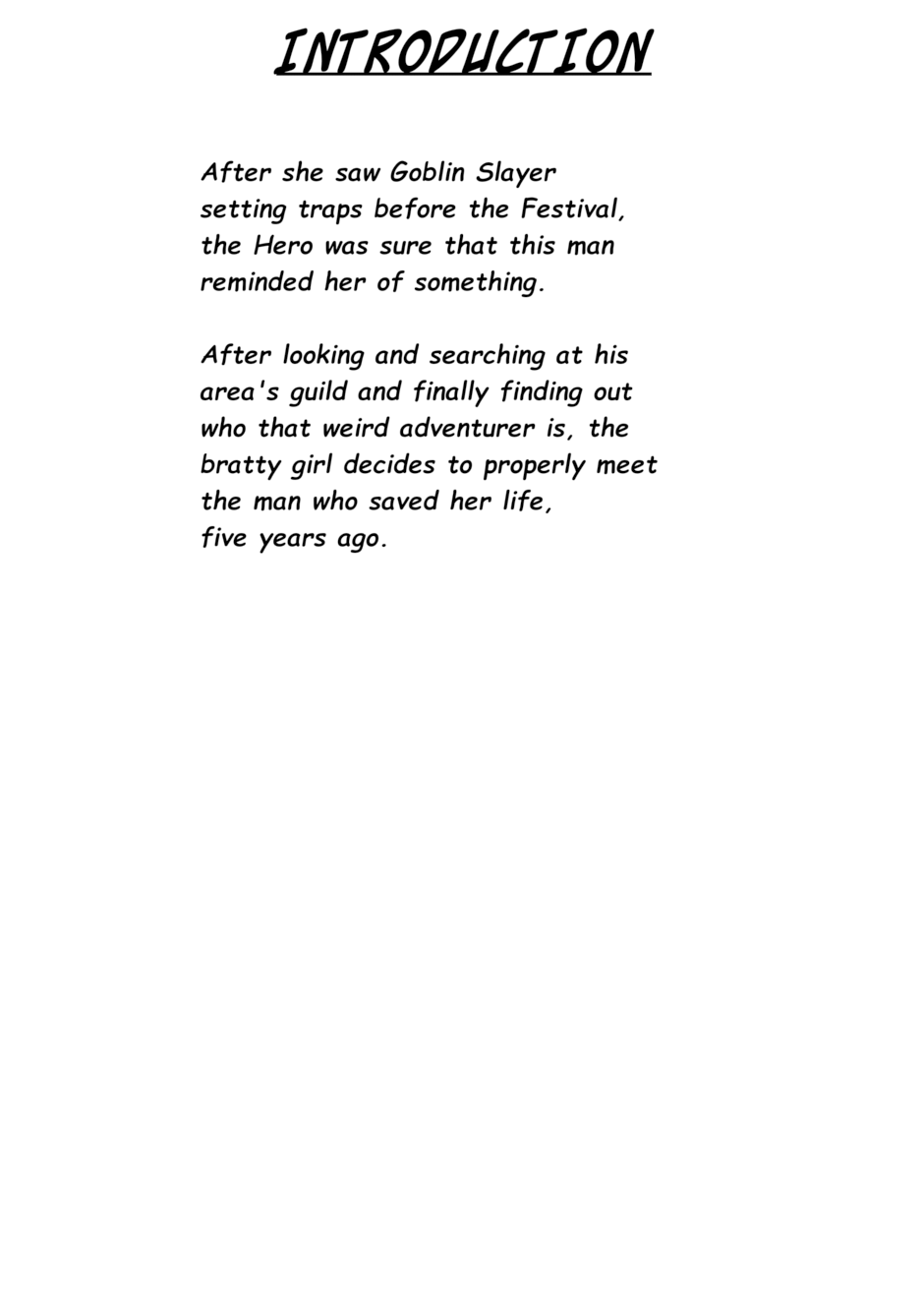 After looking and searching at his area's Guild, and finally discovering who that unusual adventurer is, the bratty girl decides to properly meet the man who saved her life, five years ago.