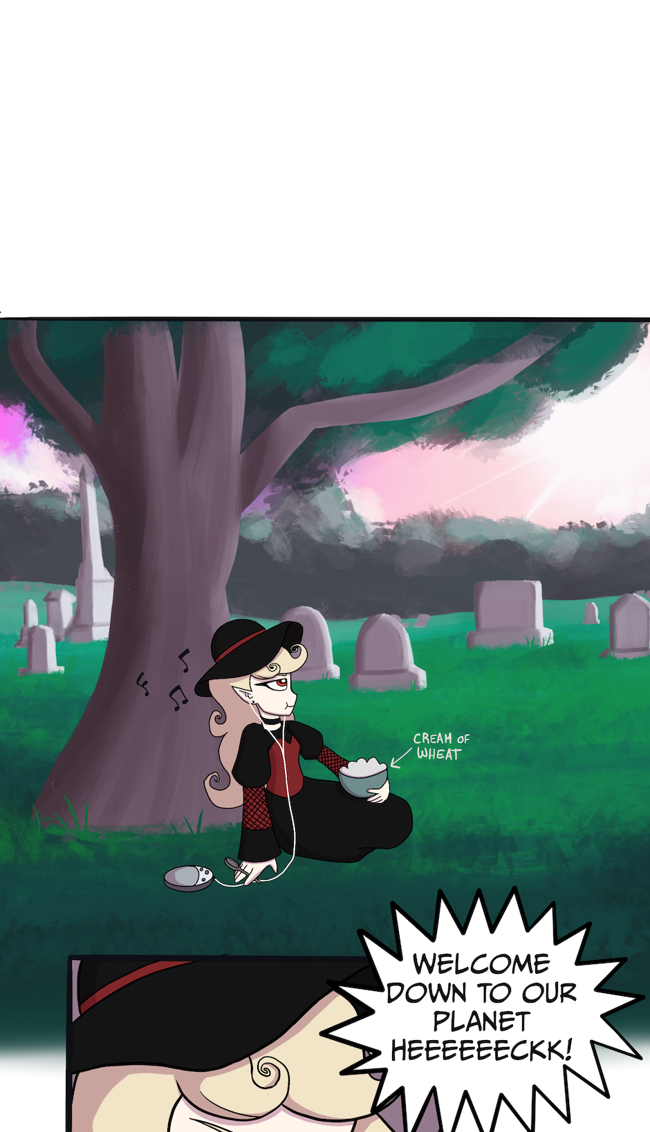 Simone loves listening to her favorite band, Bitewitch, at the cemetery. Don't bother her!