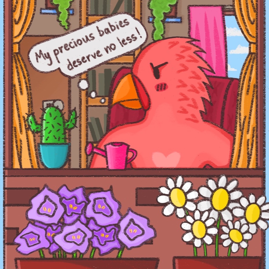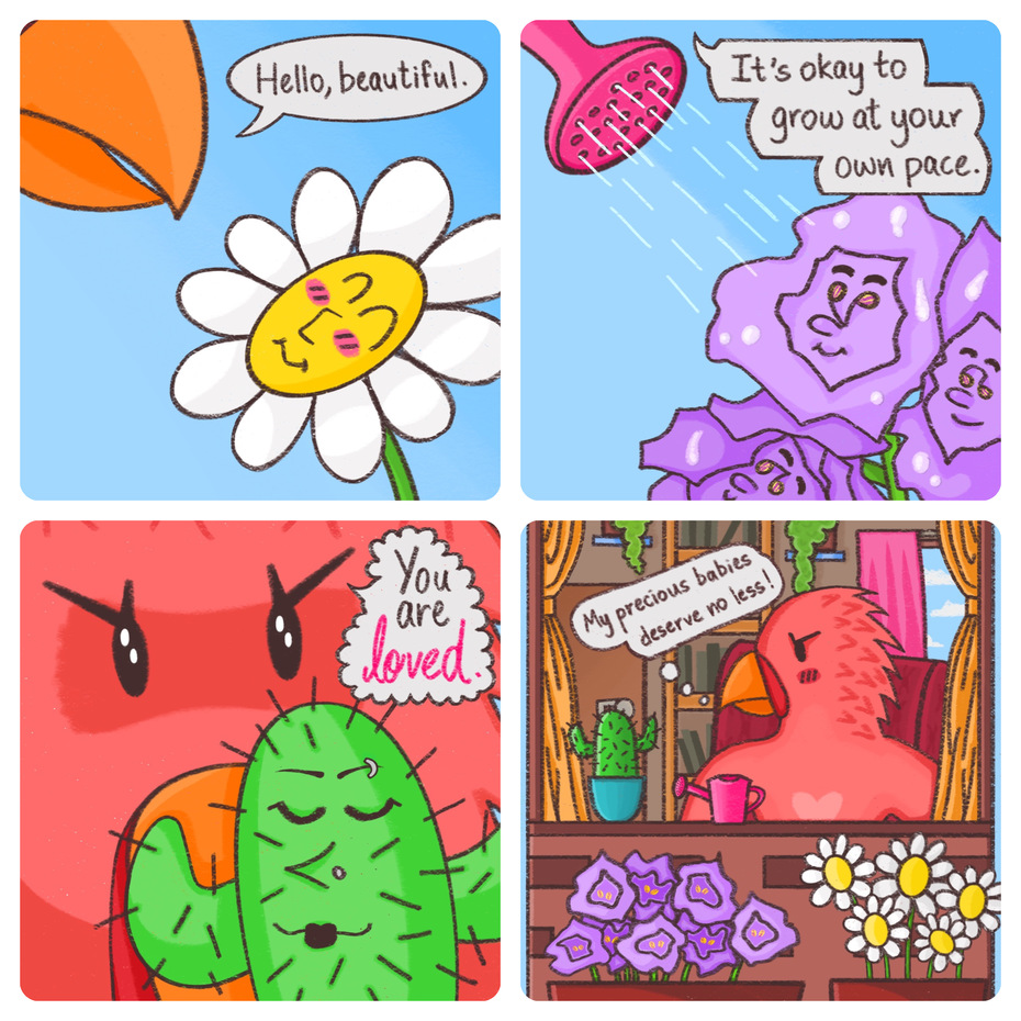 When Kreechur Kreeps is a compilation of 10 4-panel comics that revolve around Kreechur (a bat-ghost hybrid) and their friends, Kigo (a cat-flamingo hybrid), Jellypupp (a jellyfish-puppy hybrid) and Sparrk (a shark-parrot hybrid). Witness the kind of things that occur during their eventful daily lives. You can also find the panels up on @doswlfff.art on IG.