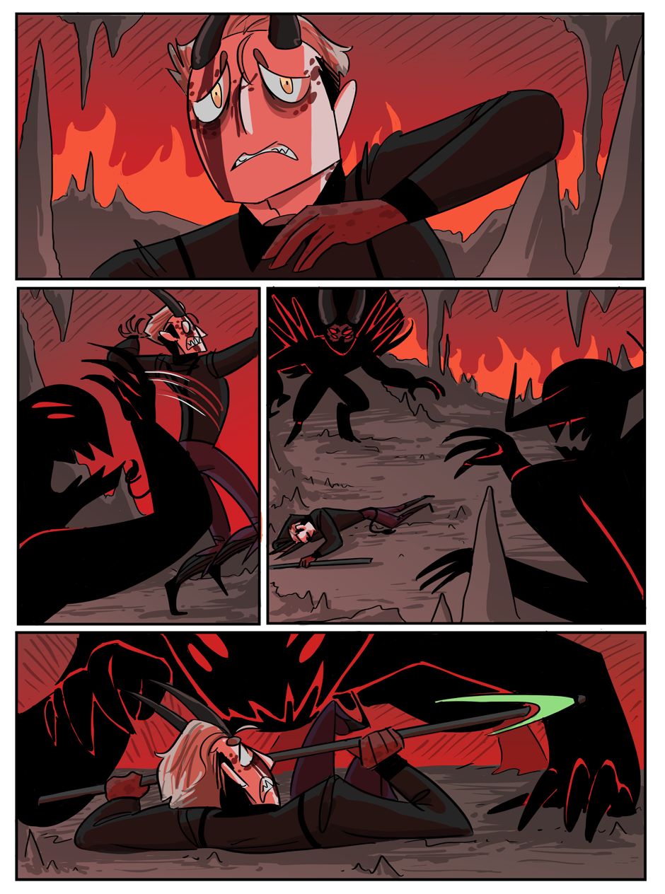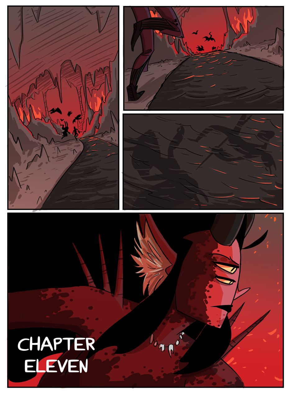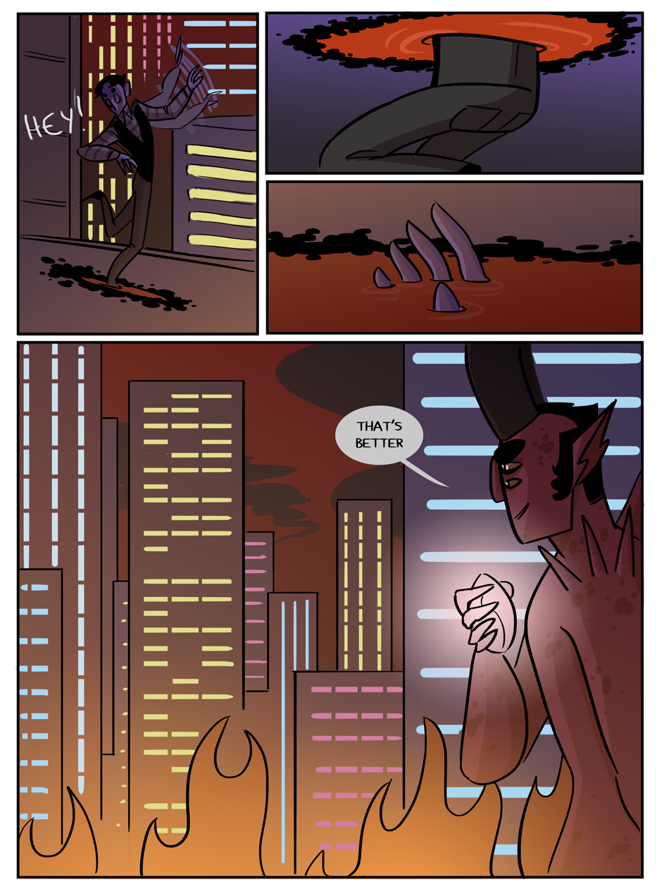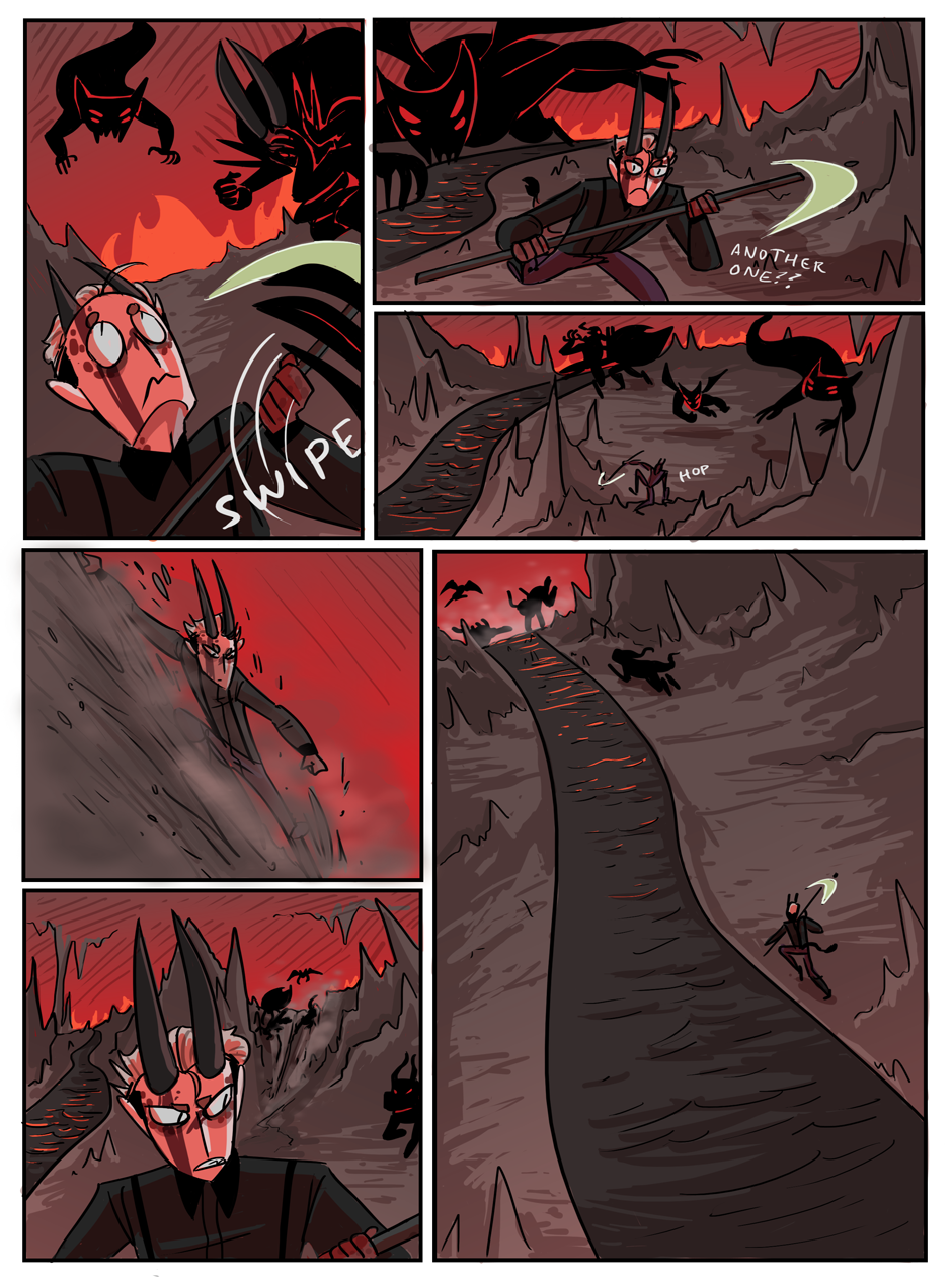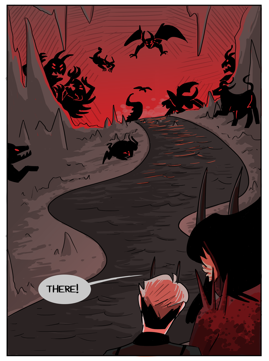 the penultimate chapter begins! Hell looks slightly different now because i decided that while the way i was coloring it before set the mood i wanted, it was too visually flat. enjoy :)