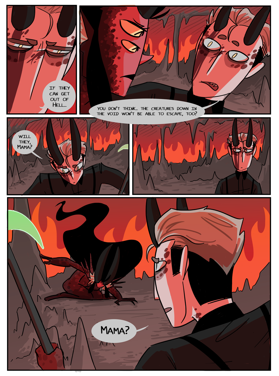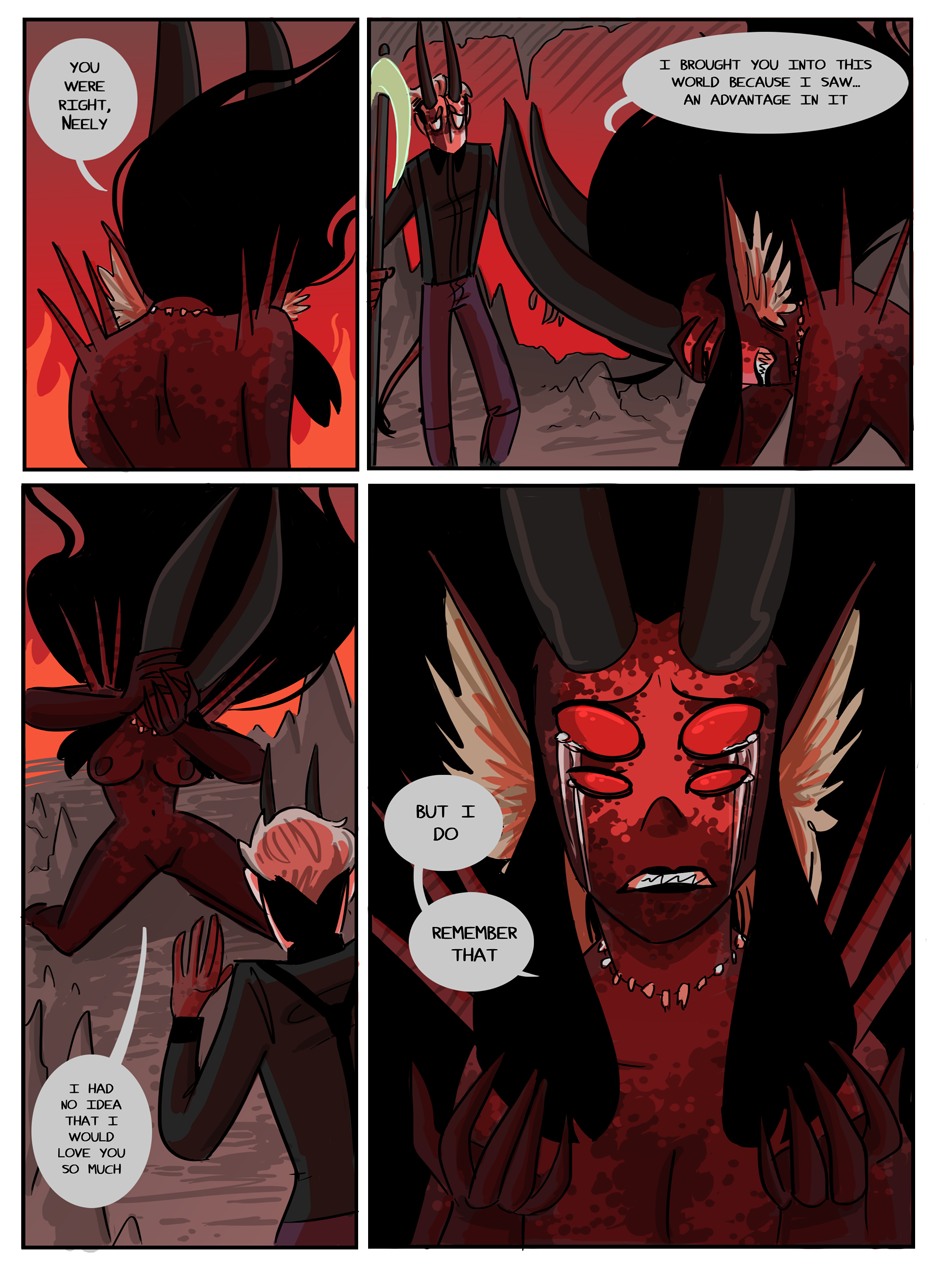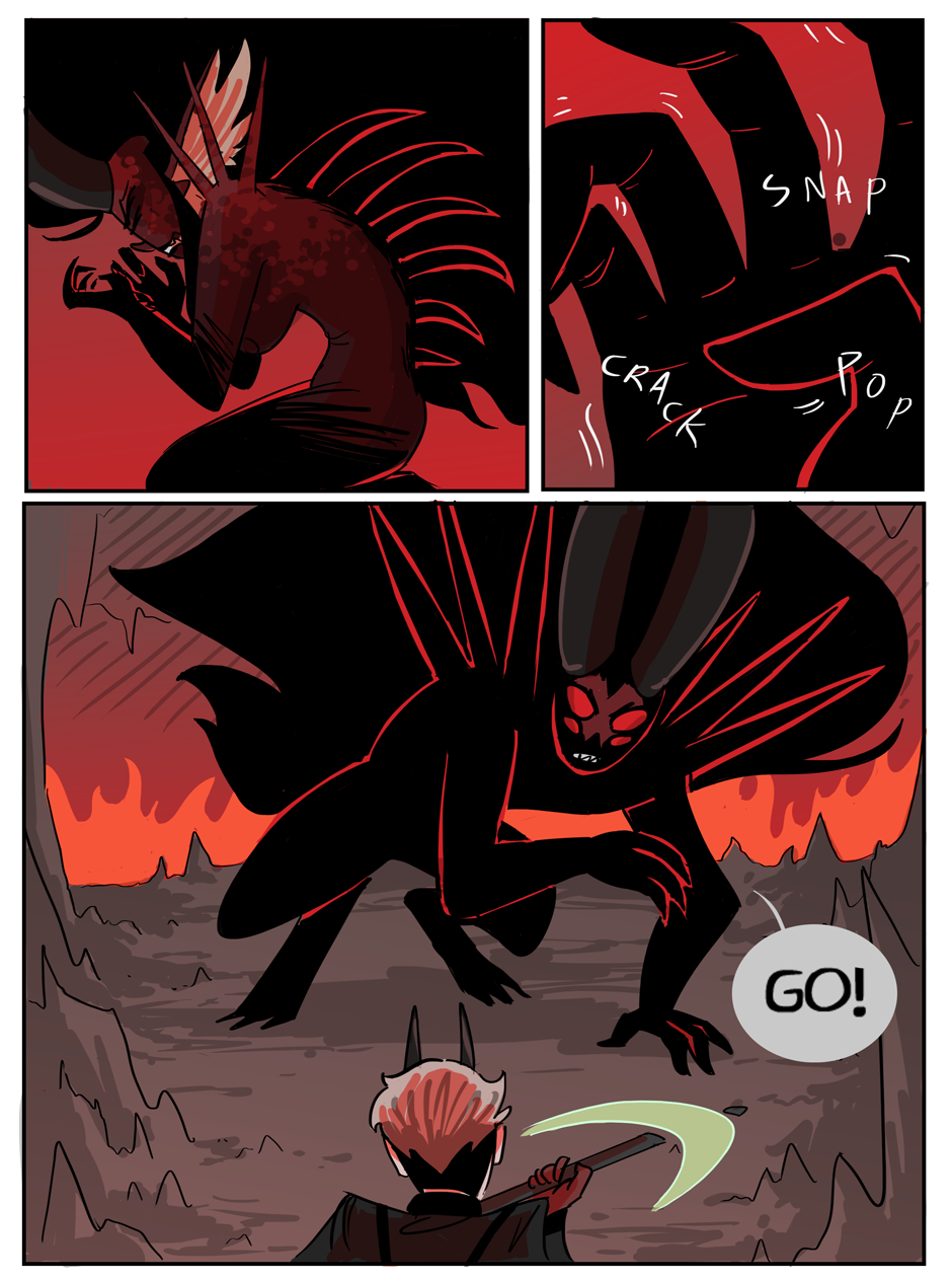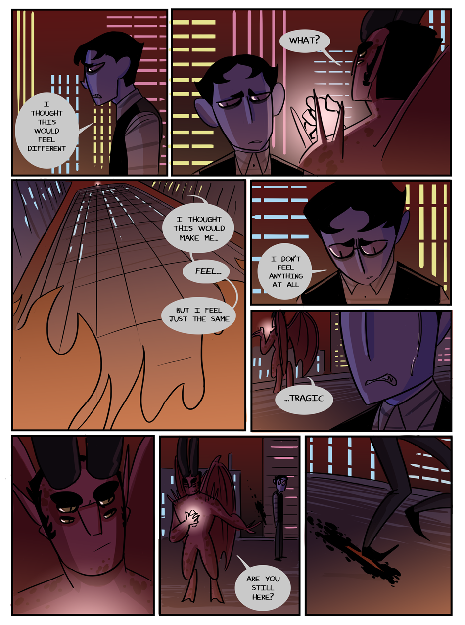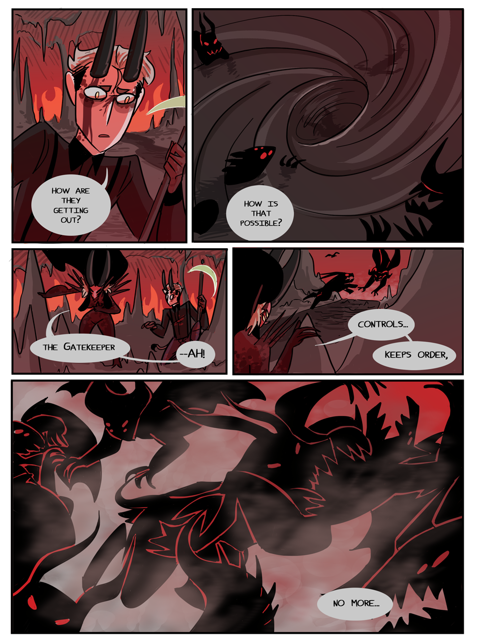 the penultimate chapter begins! Hell looks slightly different now because i decided that while the way i was coloring it before set the mood i wanted, it was too visually flat. enjoy :)