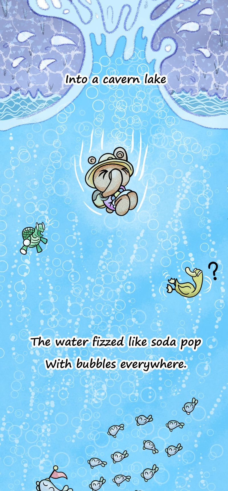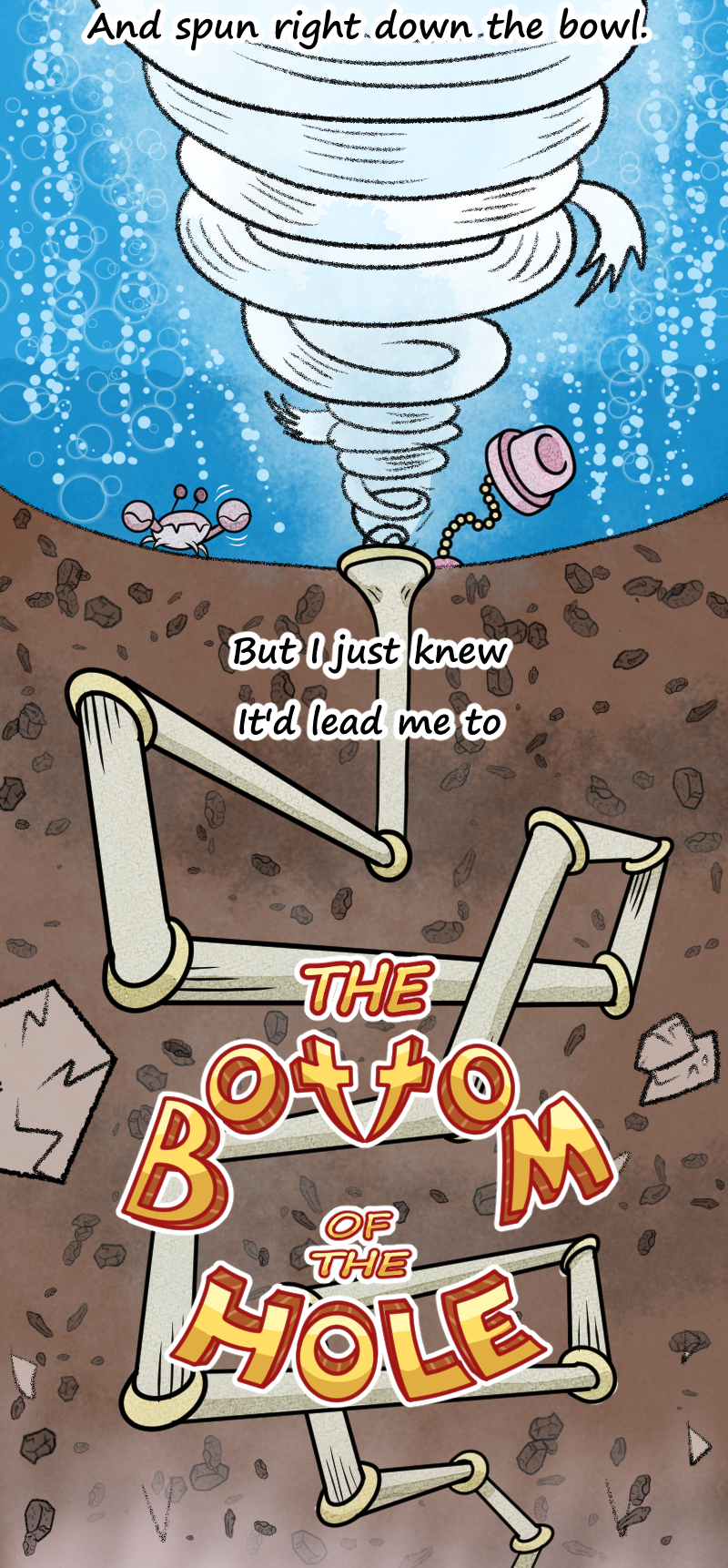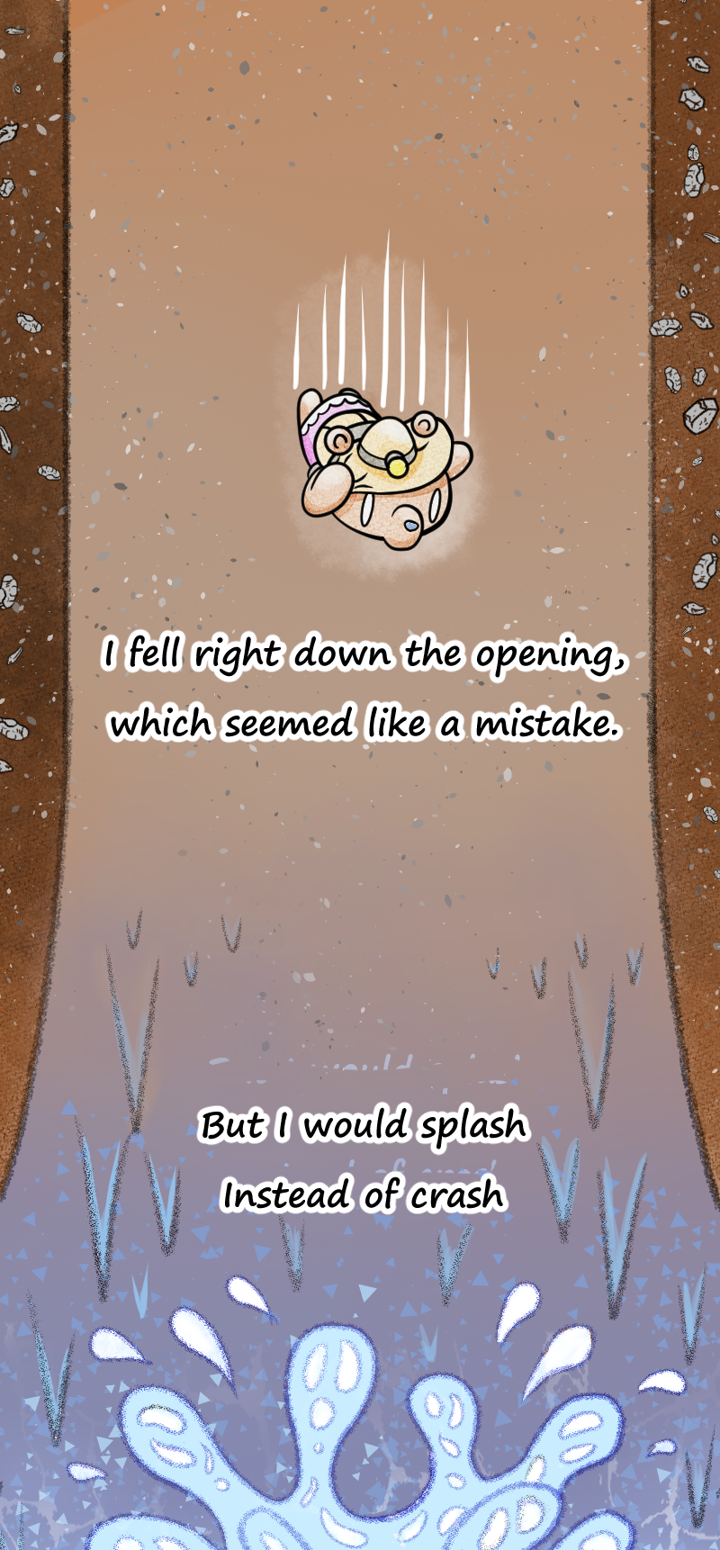 A Single-long panel graphic poem originally published for the Webtoons Legends 2025 Contest. The story follows a young bear named Berry after she finds a seemingly bottomless hole in the middle of the woods. Filled with curiosity, she ventures down to see the hole's bottom, running into countless oddities, wonders, and even dangers. But what does she finally find at the end of her journey? You will just have to read to find out. Preferred reading method is on a phone or other handheld device.