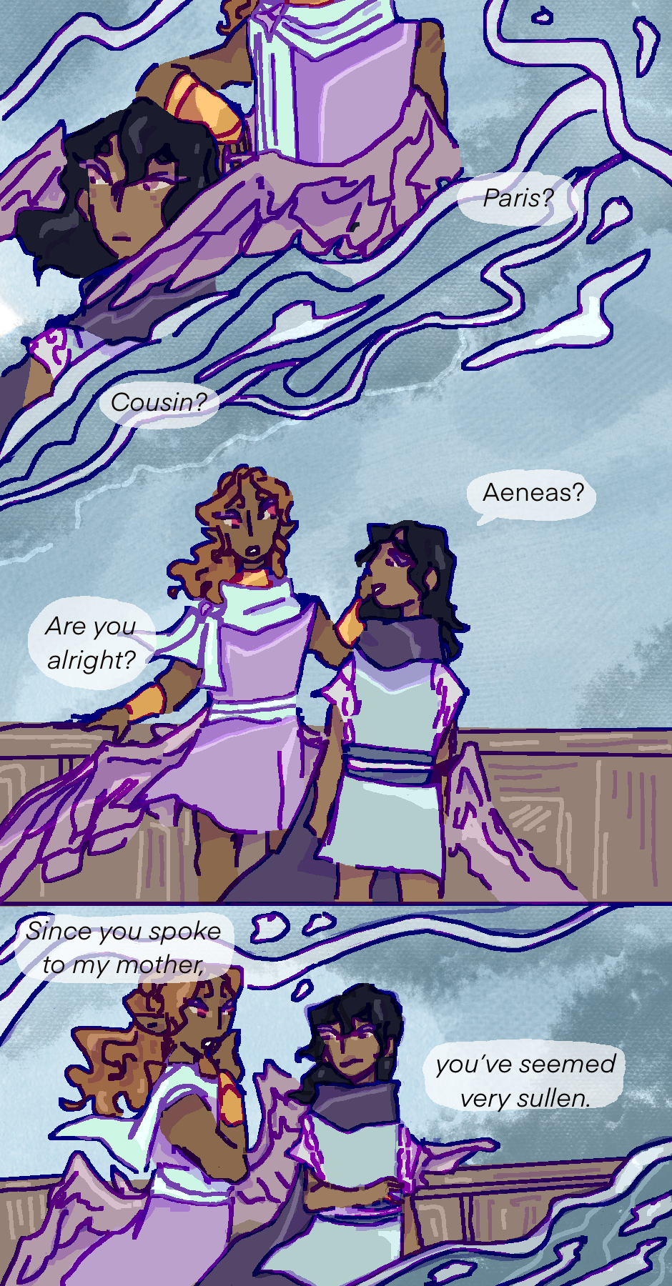sorry this is late may was very busy for me. Aeneas is a son of Aphrodite and a prince of Troy in his own right, here he calls Paris cousin as he is a cousin to Priam, Paris' father and king of Troy.