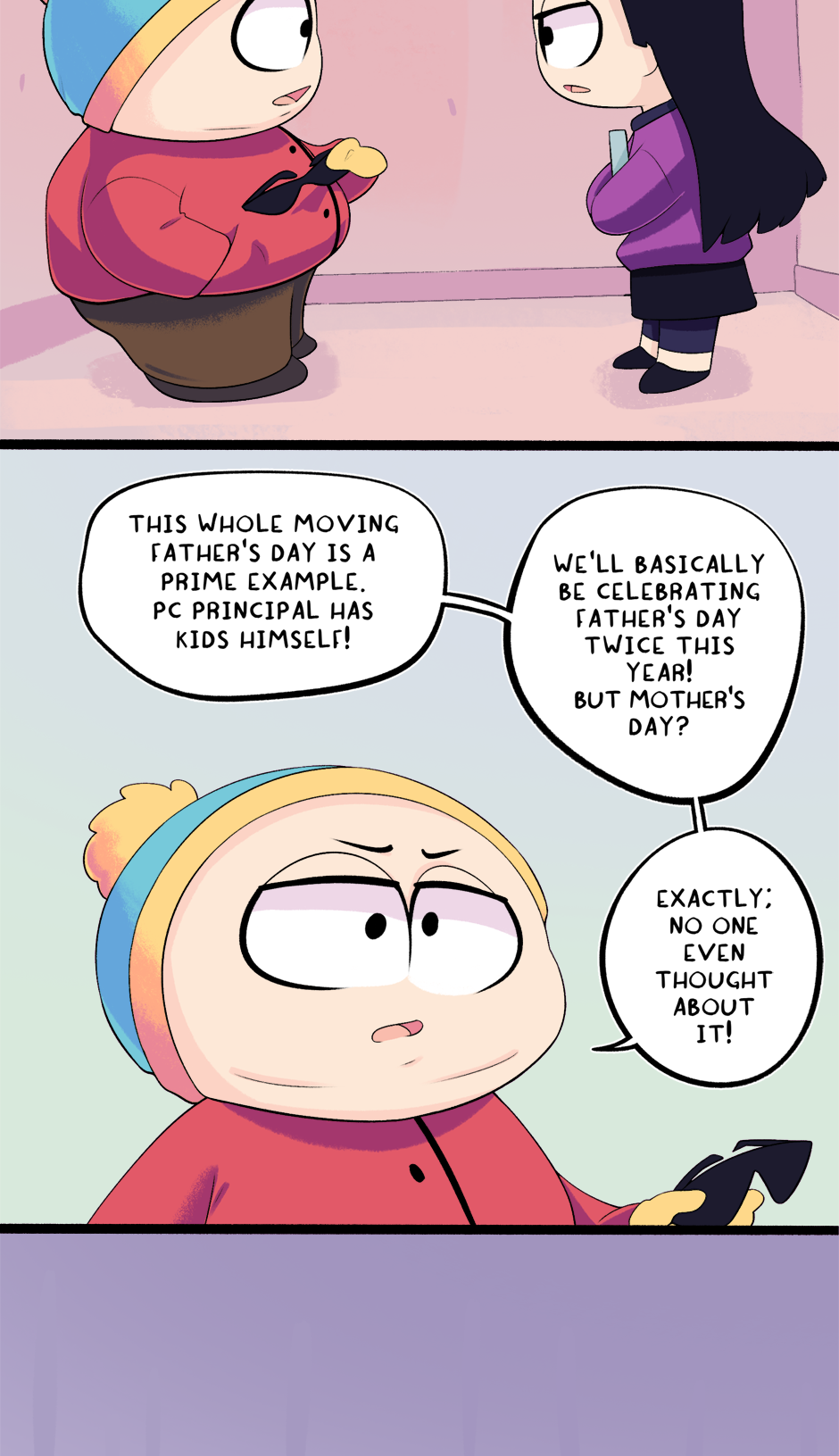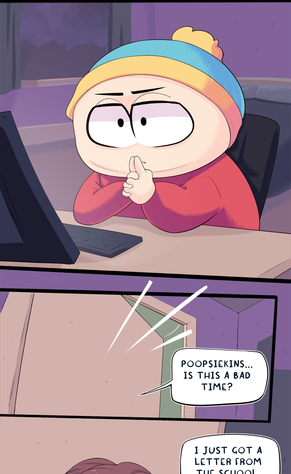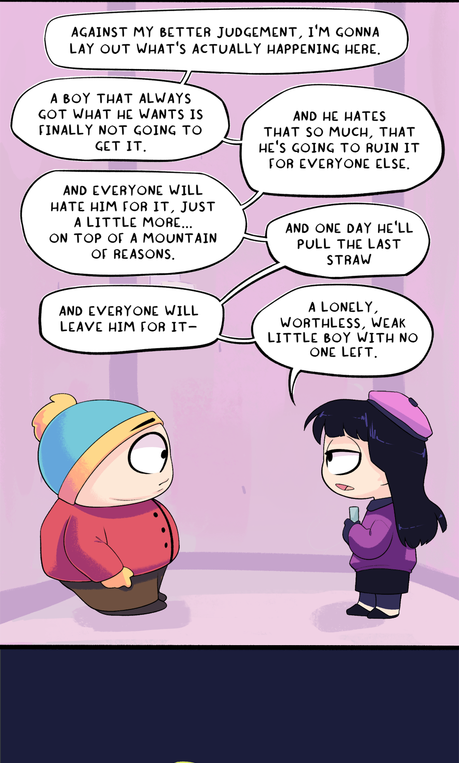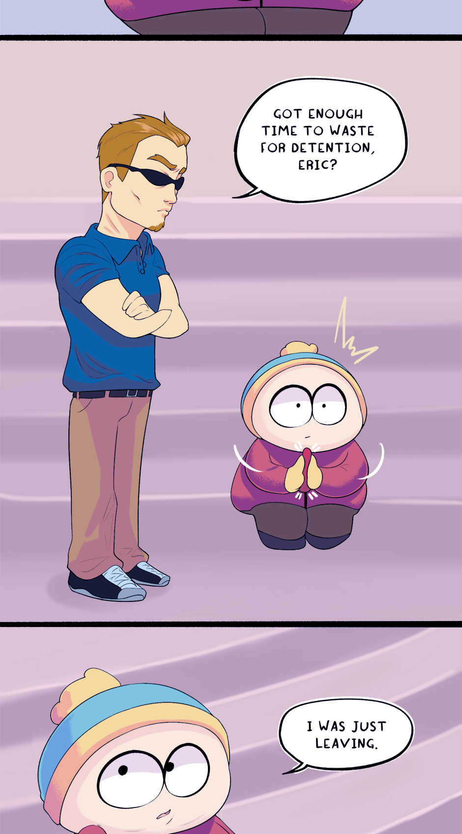 This chapter is part 2 of how Cartman got kicked out of school, with the next chapter being the third and final flashback. The next chapter is entirely planned and half-drawn already. It was originally supposed to just end this chapter but it ended up too long.