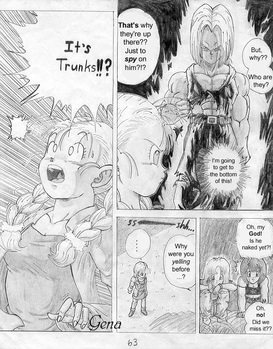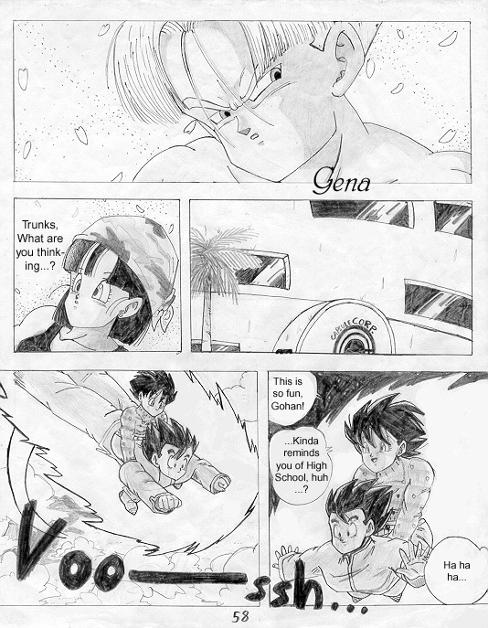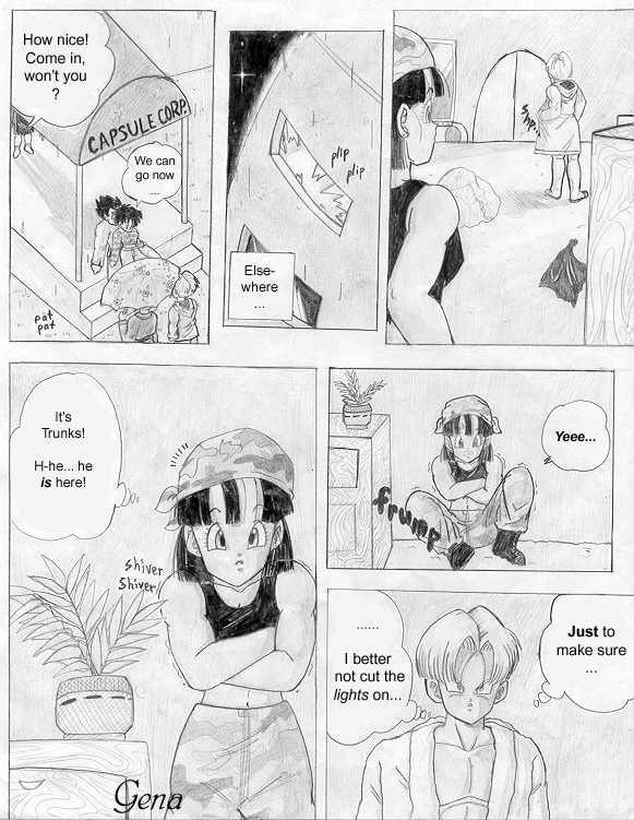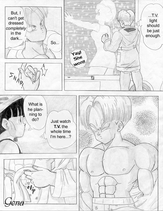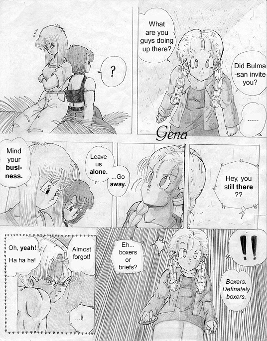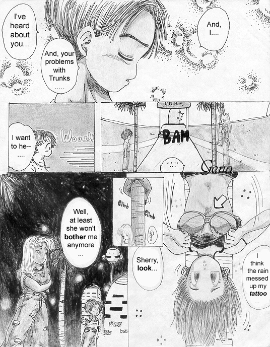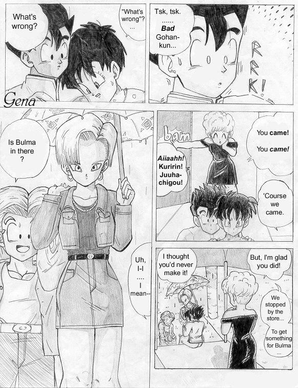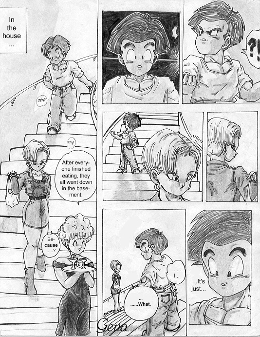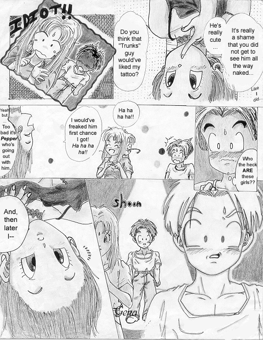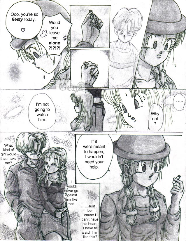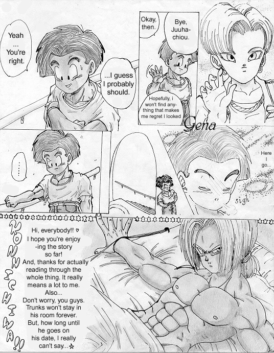 This is the first page (cover) of the "Trunks' Date" fanmanga that I began yearssss ago when I was still a freshman in high school (in 1999-2000). This story takes place a couple of years after the end of Dragonball GT... (Pan is around 18-19 yrs. old). I needed to find another place to put it because the place that's hosting the storie now has a limit to how many pictures you can submit. @_@
