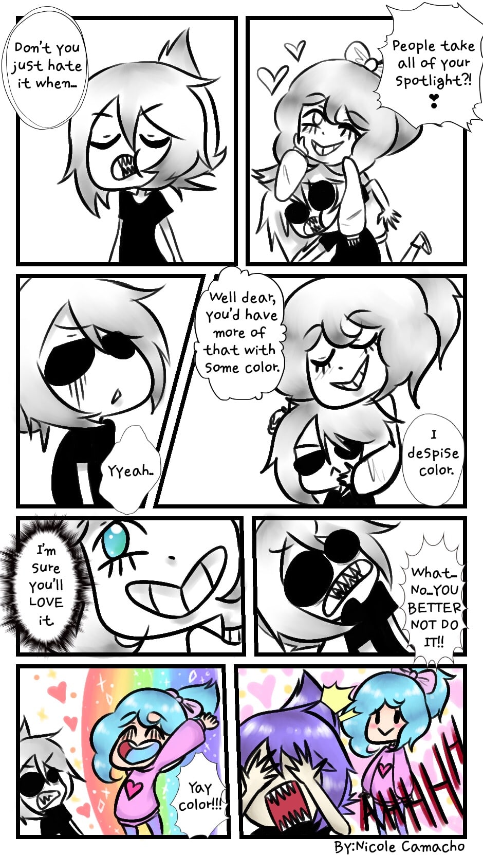 Candy is the cotton candy queen of color, aka the opposite of Nurika (Nuri). She bathes her in color, even making her hair purple for some laughs.