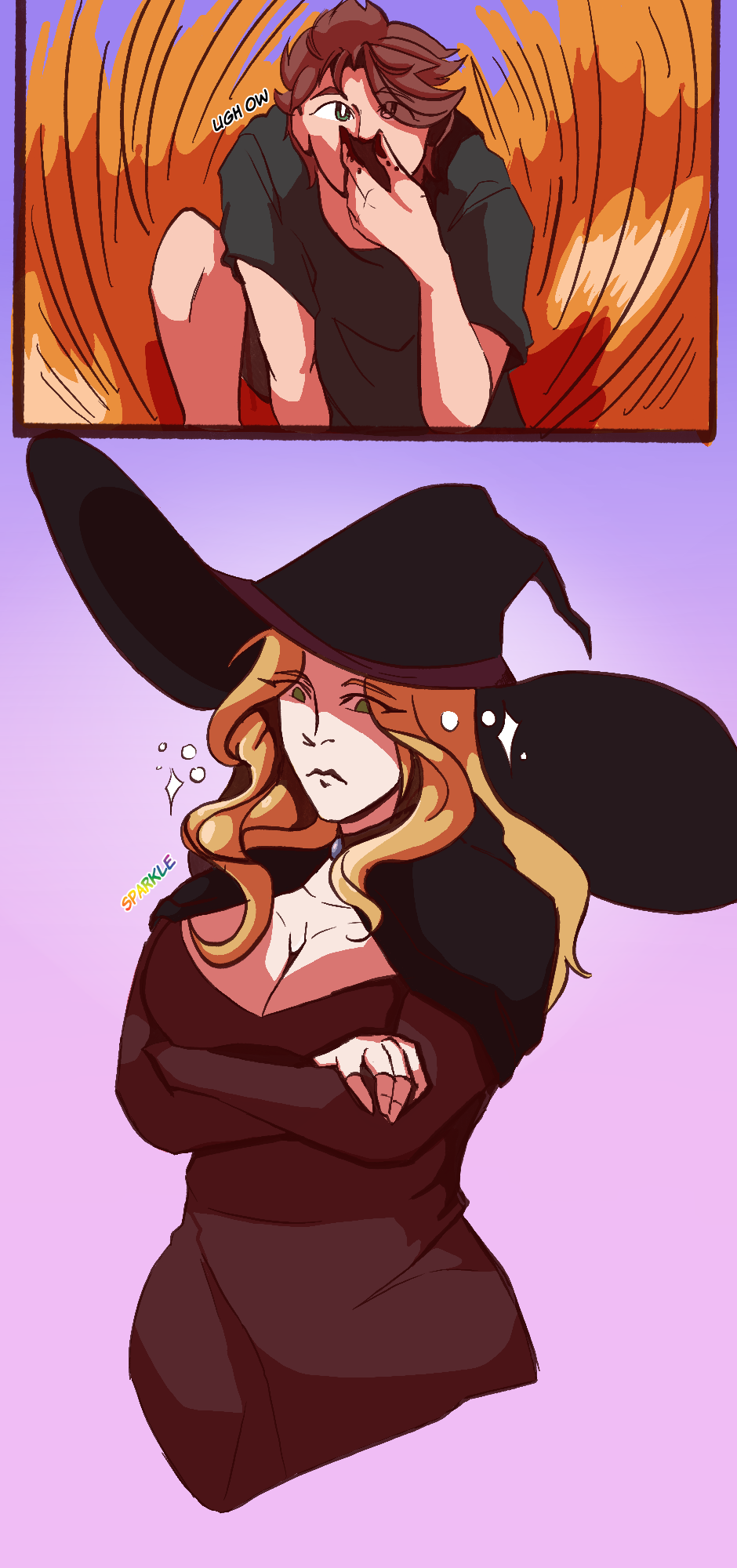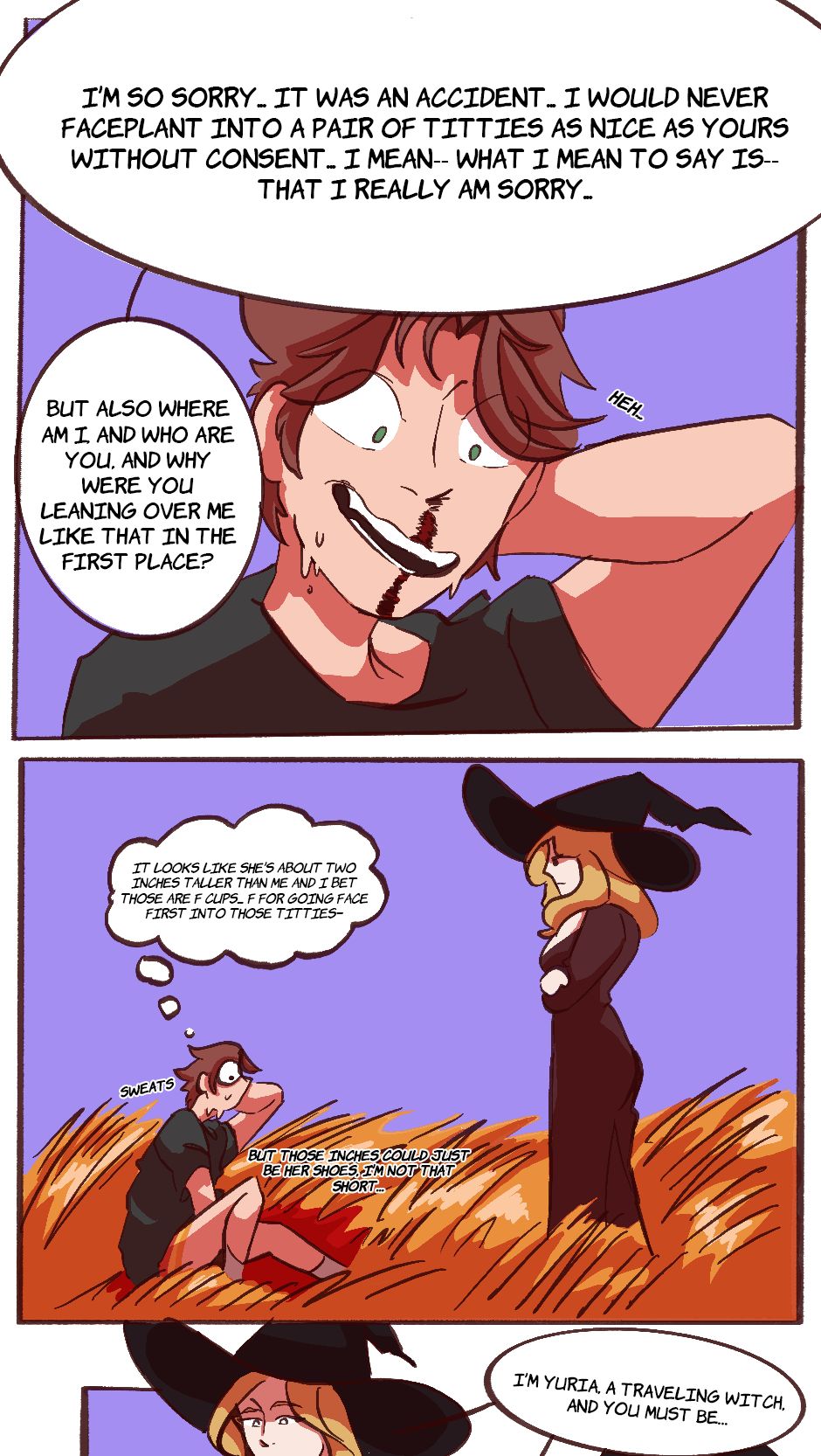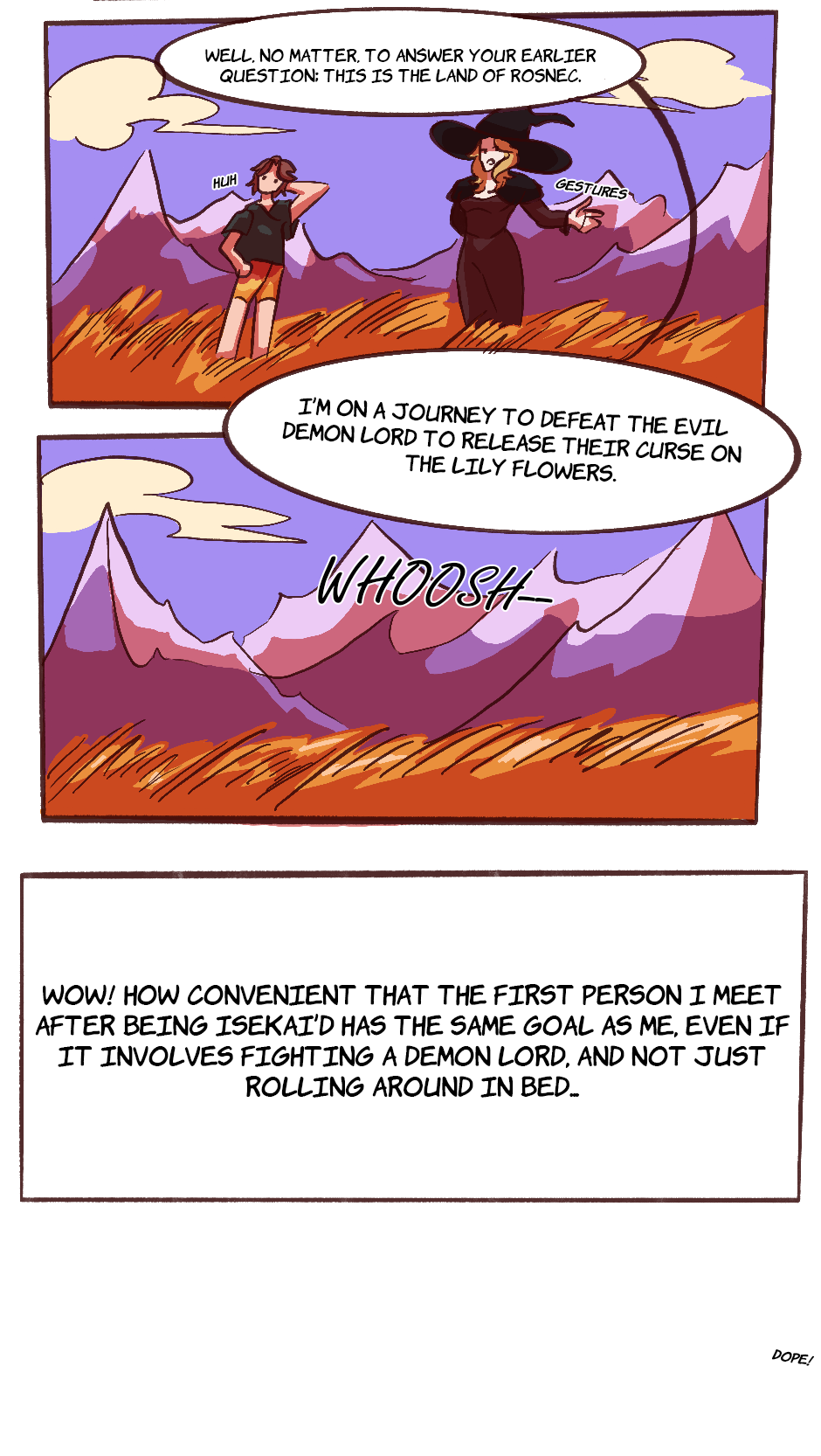 What happens when you’re isekai’d from your bedroom in the middle of a traumatic event and dropped into a field of amber waves of grain? Naturally, you meet a hot witch babe who you’re instantly whipped for and would sacrifice yourself on the spot. In fact, you do sacrifice yourself… For the cause! Definitely not because she’s the woman of your dreams! You decide to join her on her quest to rescue the lily flowers and return them to their proper home: the bedrooms of the say gex havers of Rosnec. Join MC and Yuria in their journey across the land of Rosnec to rescue the lily flowers from the evil demon lord. Golden Retriever Butch x Femme Fatale Witch: Updates Biweekly