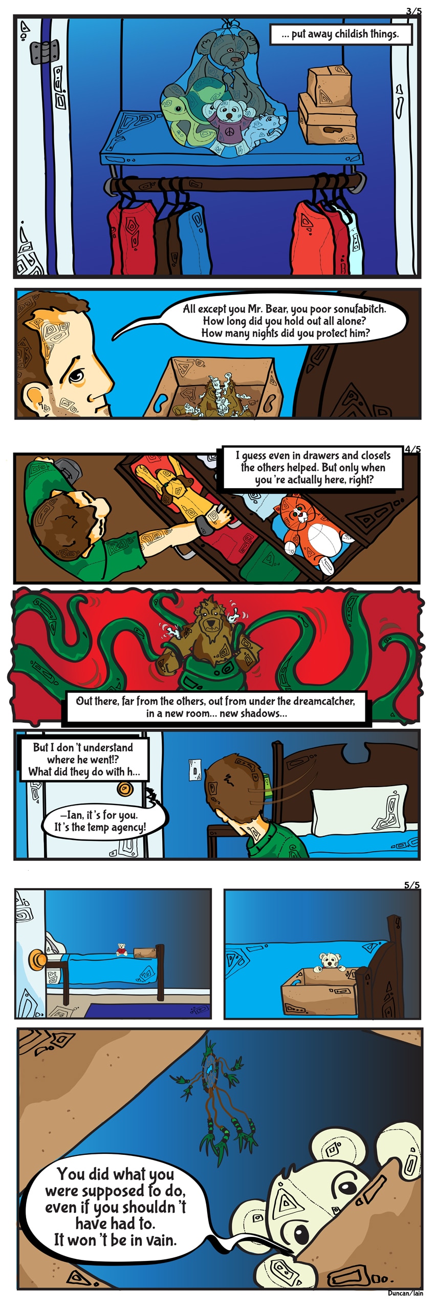 once again, my affection for these characters is tested. i have to admit to creating quite an admiration for mr.bear. i recall distinctly the welling-of emotions form reading roby’s script and realizing i would have to illustrate bear in trouble. it caused a bit of upset in the stomach (it didn’t matter that it was only ian’s imagined end, the fact that the reality of what happened is bound to be more gruesome was a bit upsetting)–i have learned roby is unafraid to pull punches when it comes to graphic-stuffed-animal violence.