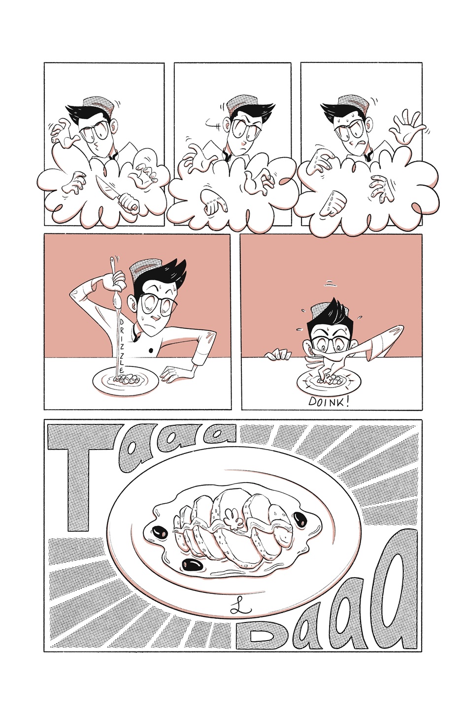 Two pages this time (!!!), because I thought it was cruel and unusual punishment for everyone to wait a whole week for three pretty lackluster panels, haha. Also, for the sake of the story, let's just pretend I'm good at plating food up and making it look presentable. Julian is trying, but I'm no chef!
