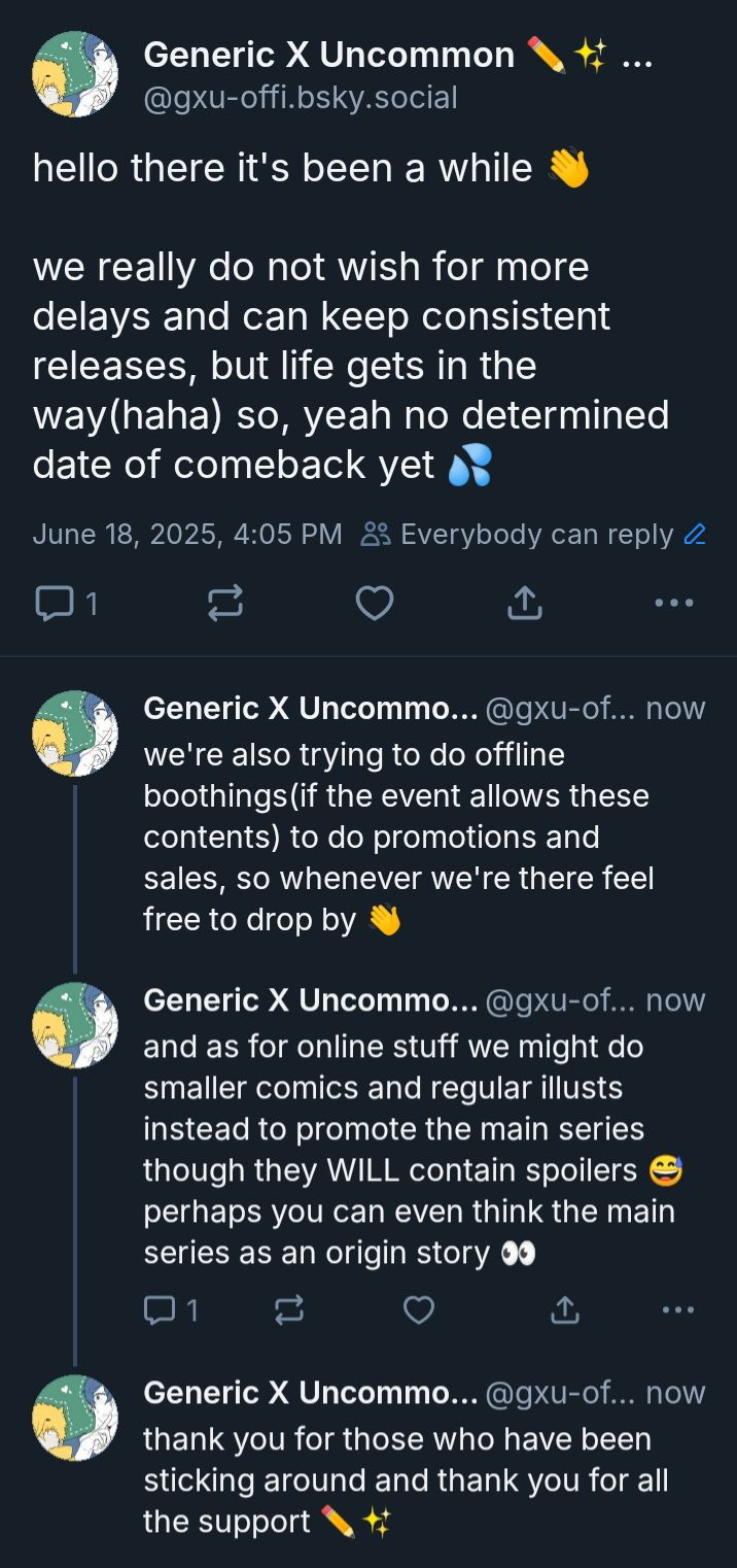 this is not a goodbye or "i will be back soon"*never updates again* but i'm trying to be realistic and focus more on smaller comics and illusts instead of the main series for now ✏️✨ go follow on the accounts above if you're interested
