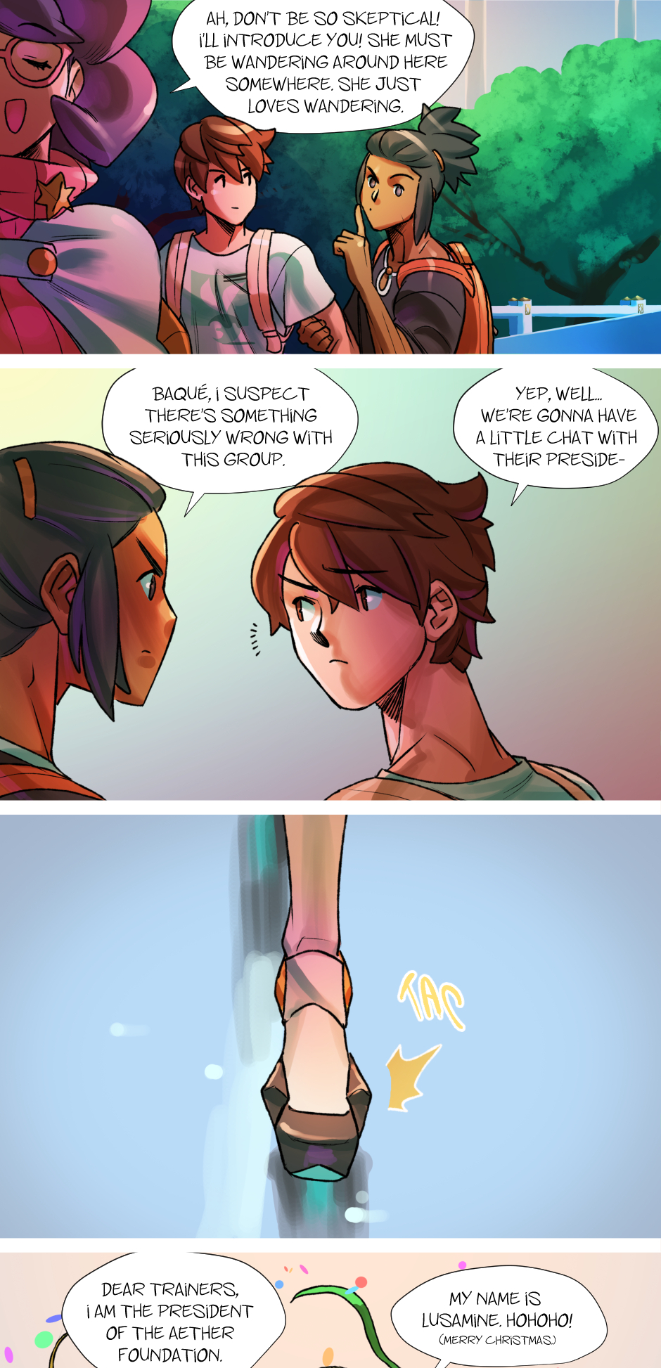 Between disastrous dates and strange encounters with the Aether Foundation, Baqué’s coming-of-age journey slowly shifts away from battling and honoring the Guardian Deities, and will turn into something less about winning fights, and more about figuring out life and love through pure situational embarrassment.