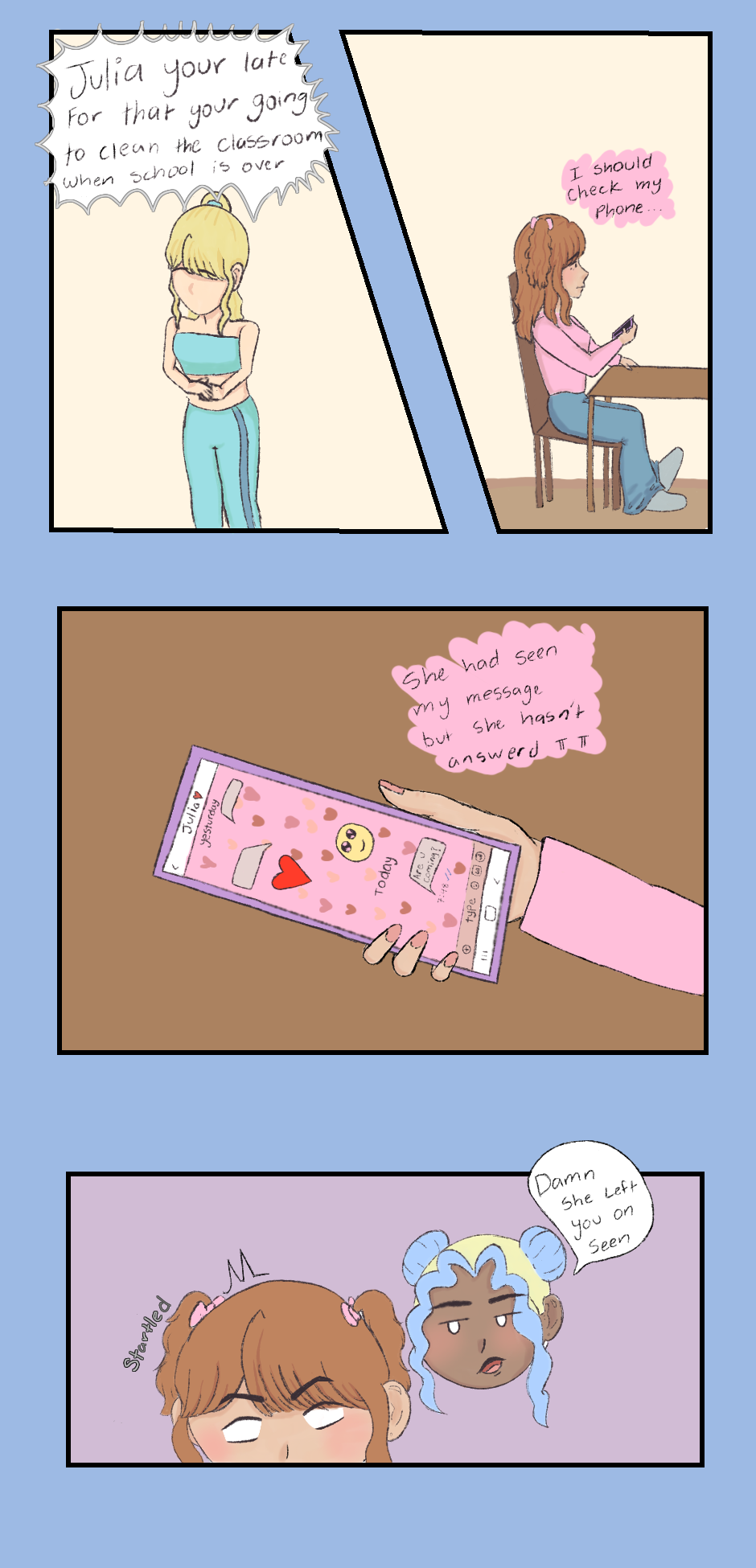 One of the girls falls in love with her bff( J ), but she doesnt know if her bff likes her back. Her bff is figuring out what's her sexuality is and questioning if she likes her bff (W). Both girls dont know that they might like eachother. End the end they would probably be ....