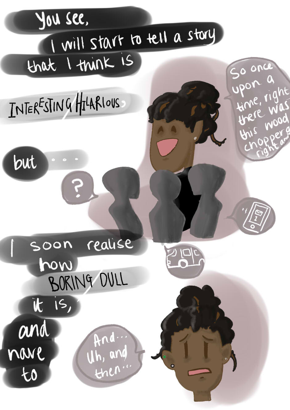 I hear myself telling a joke or some "funny" story, and it sounds so awful, and I swear everyone's eyes have glazed over, and I just round the ending up nice and quick so we can all move swiftly on.