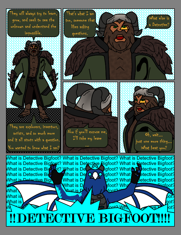 The final chapter of the first season of Detective Bigfoot is here. I hope you all enjoyed the series. I shall be taking a hiatus for the time being to focus on other projects and life stuff. But don't you worry, we will return to the world of Detective Bigfoot if there is enough outcry for it! Keep questioning the world, everyone.