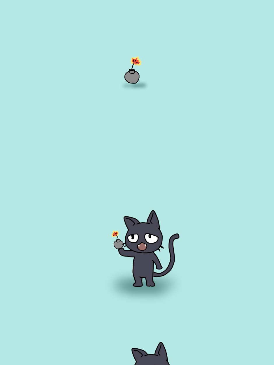 kibo finds a bomb, kibo doesn't know what to do, kibo eats the bomb, kibo flies to the air as the bomb explodes and smoke comes out of his butt.