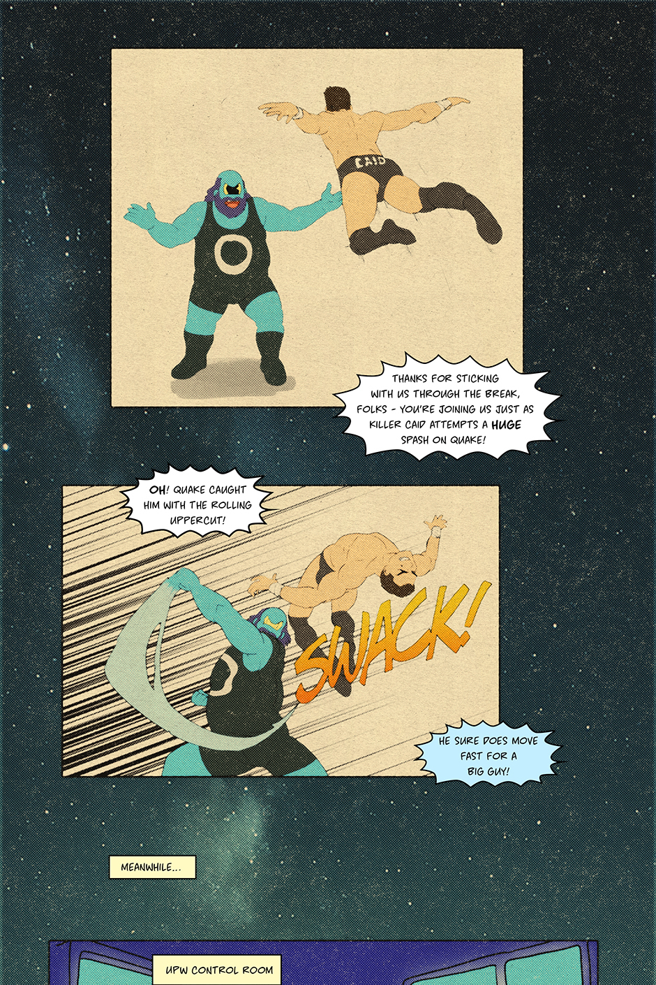 When the crowd unexpectedly pops for him *really pops* the fabric of narrative reality begins to tear. Now, ancient booking gods, cosmic champions, and the current ruler of all existence have their eyes on him. But Caid? He’s just taping up for next week’s match.