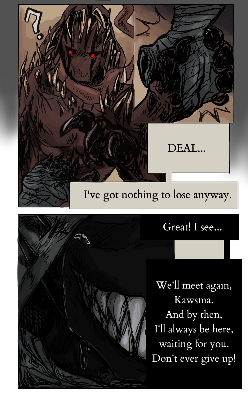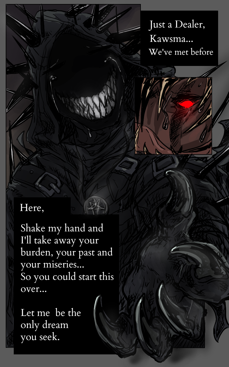 Kawsma waking up in the realm of Depresso. Making a deal with him, that will set him back from now on...