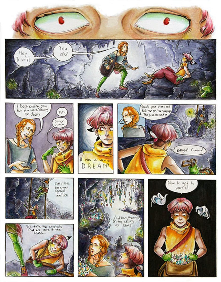 Based on the mythological story of Icarus, Icari is a short comic about a young girl who lives in a cave secluded from the world above. Despite her friend's complaints, Icari is content with her current life. That is, until a mysterious traveler ignites a series of events that opens up her eyes.