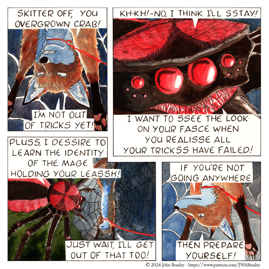 still not getting one hundred percent villain vibes off this spider. very neutral, natural give and take from a spider perspective. honestly i hope she can teach arrogant mr fox a few things