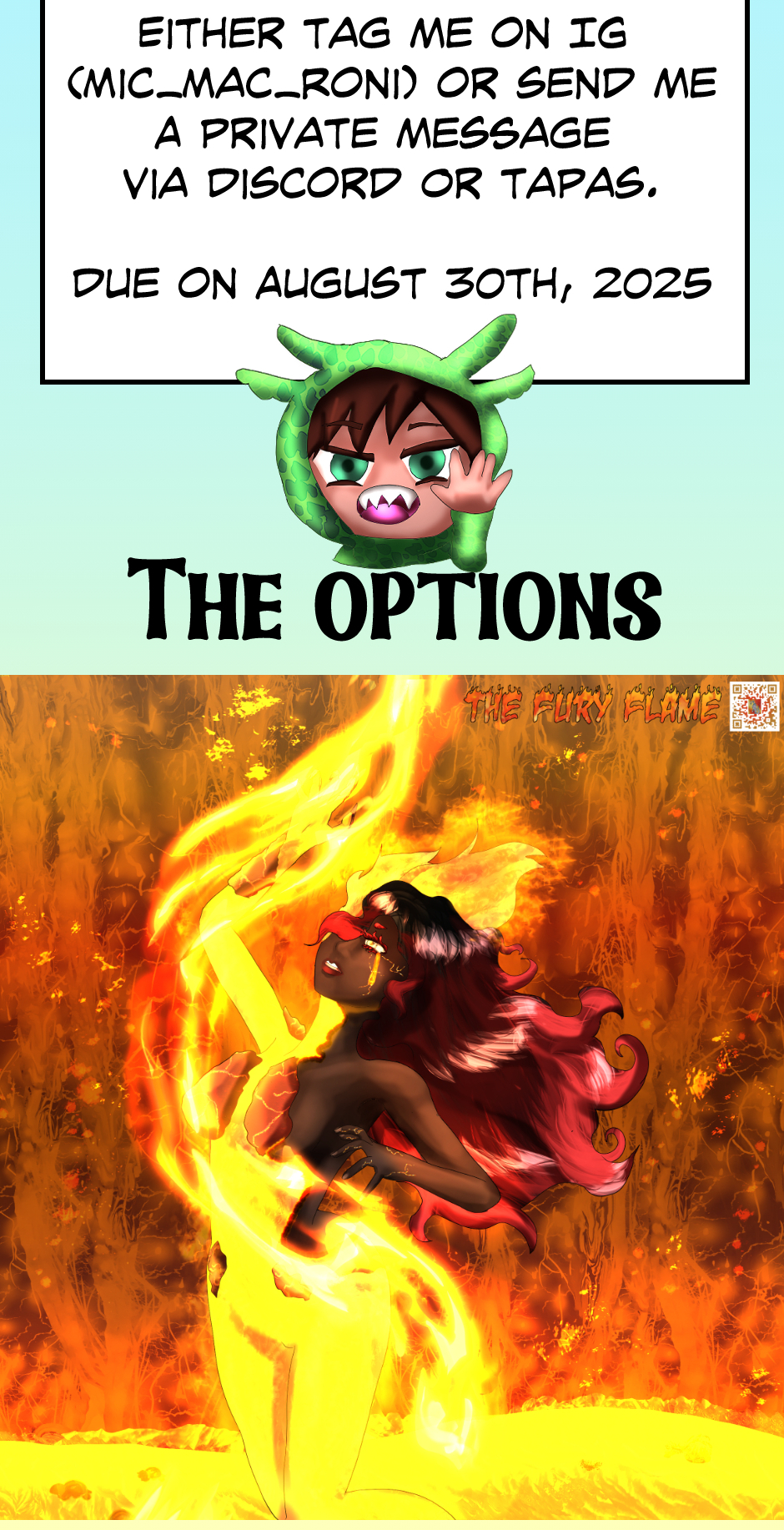 Have fun! You can message me on discord and tapas or IG! The last two episodes posted today https://m.tapas.io/episode/3586046 https://m.tapas.io/episode/3586106 If you want to start the story from the beginning this is the link. https://m.tapas.io/episode/2888044 Also happy 4th of July!