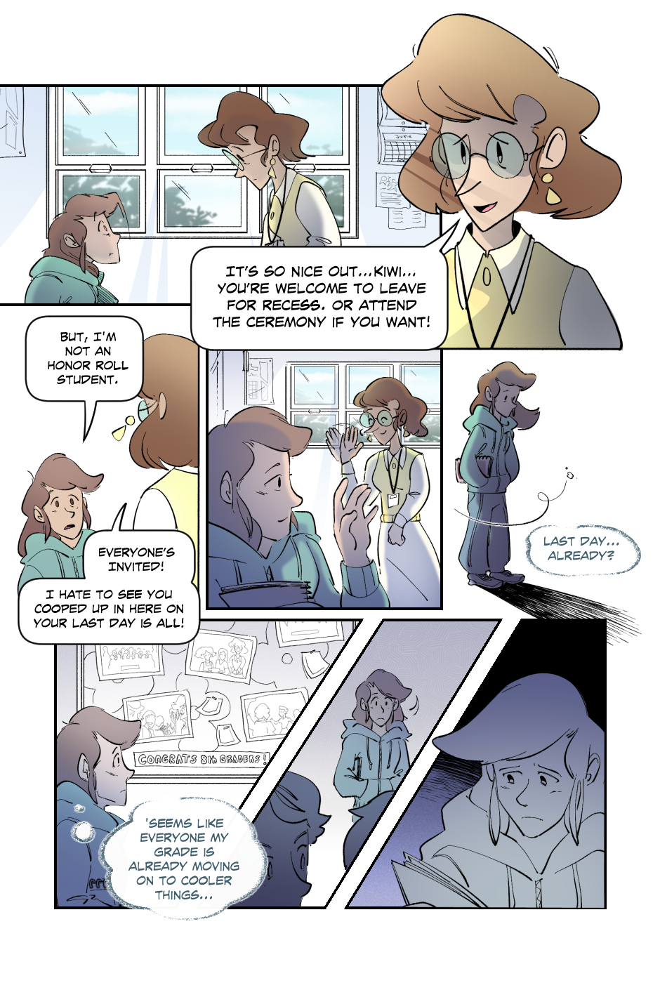 After having a very brief conversation with her teacher, Kiwi decides to head for the auditorium. She later discovers that her last day might be more impactful than she realized.