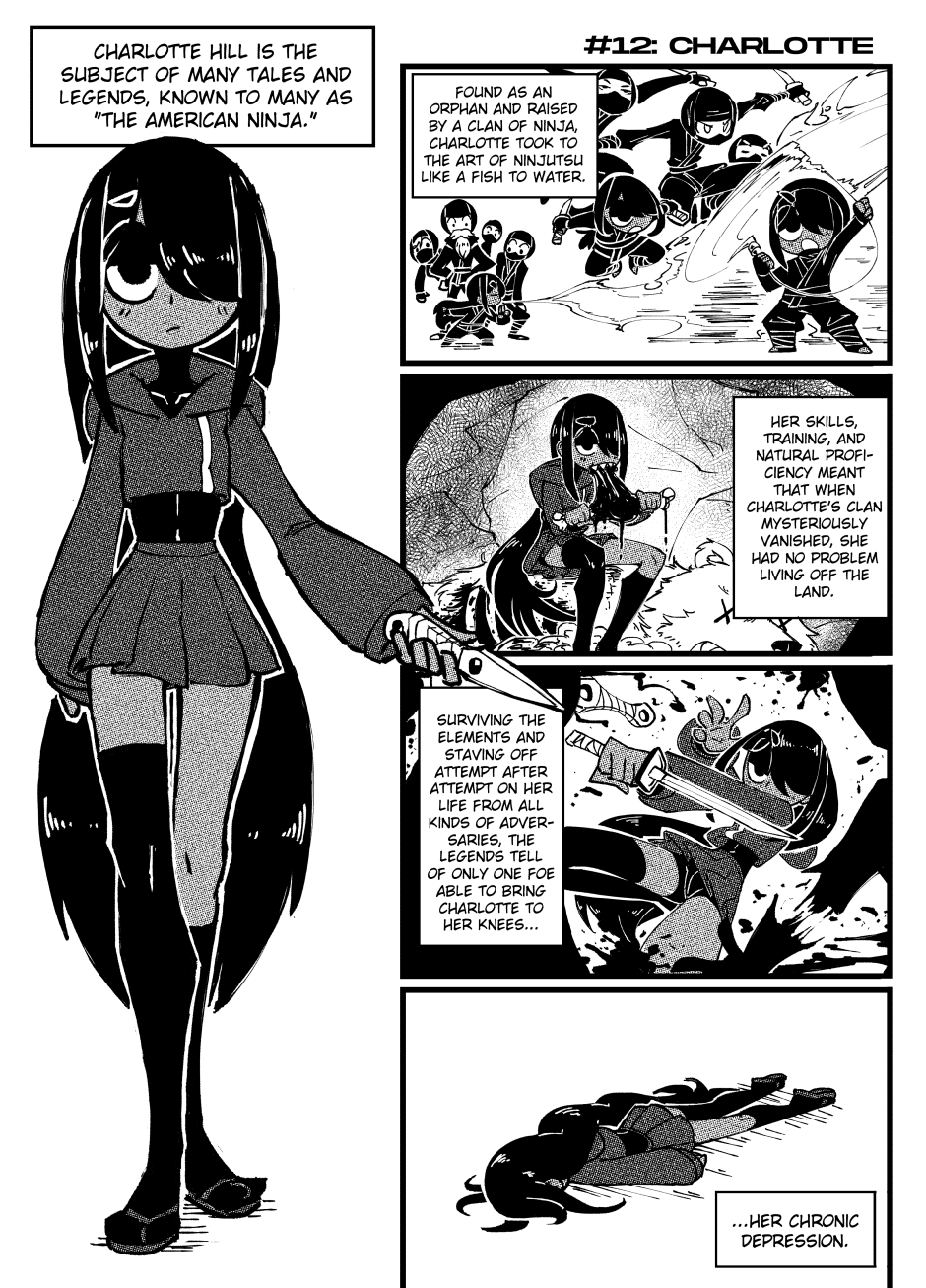 millennia ago, the world ended. in the midst of a corporatised hellscape that was rebuilt, we follow Yume, a vice-riddled angel who collects trauma like trading cards; Charlotte, a highly-adept but clinically depressed ninja with no verbal filter; and Halphas, a socially maladroit demon with delusions of grandeur and a tentative grip on reality, as they all just try to have a good time. they're not succeeding, but they're trying.