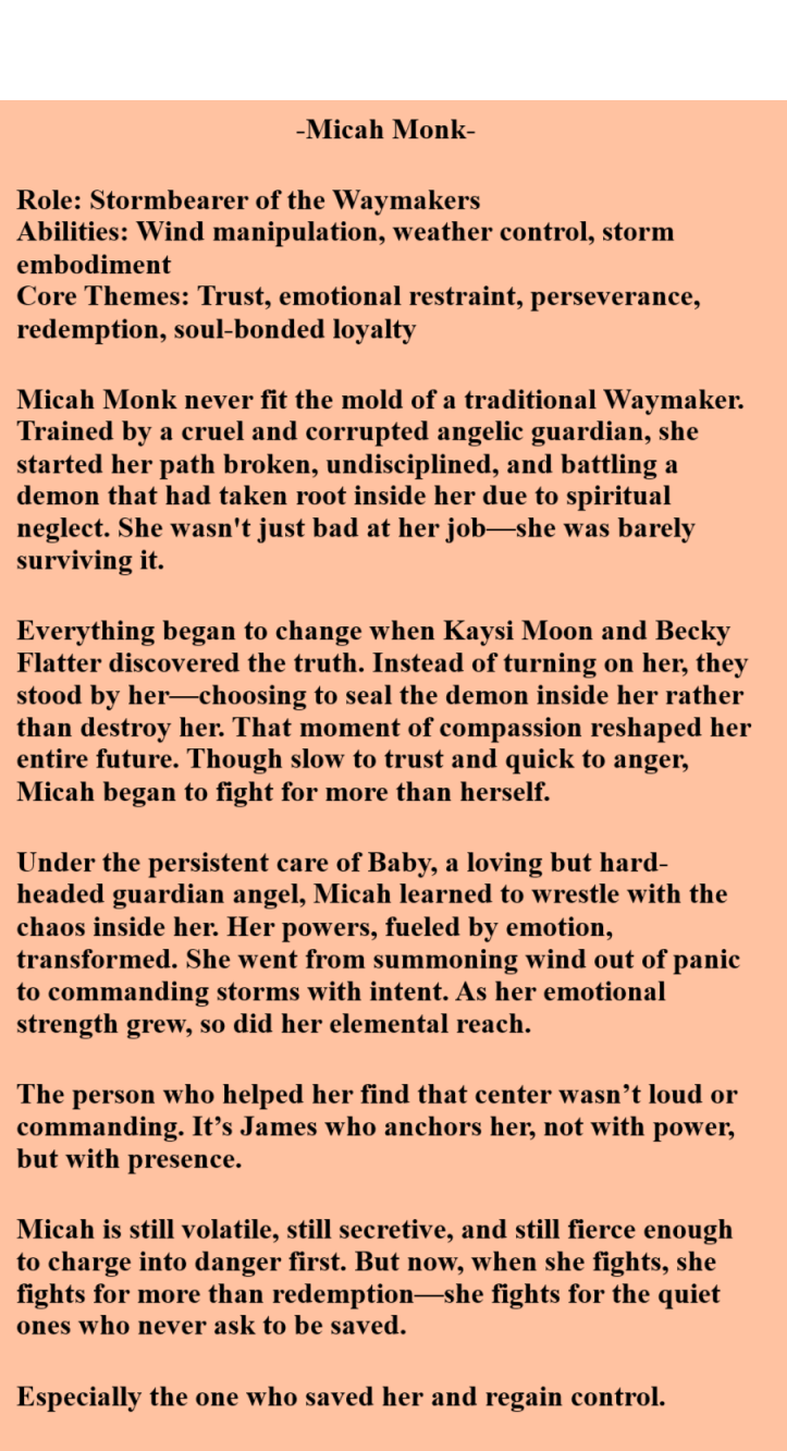 Micah is the stubborn strength of the Waymakers her fighting spirit drives others to not give up.