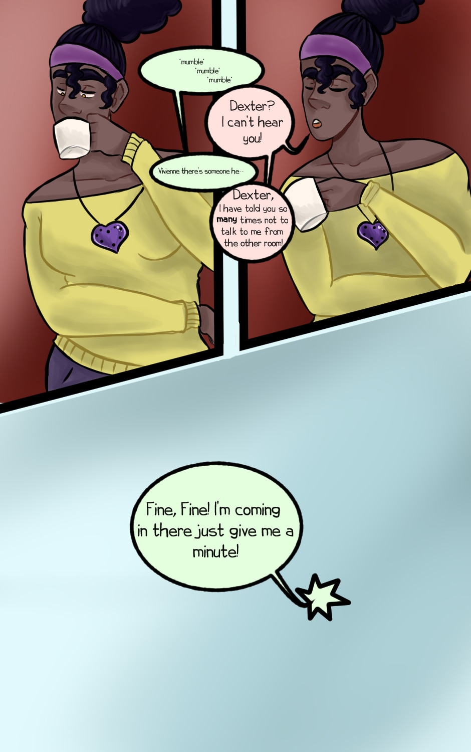 Another character's about to be introduced. One who rudely talks through walls. Speak up, pal. I had a spelling error there for a second but I fixed it.