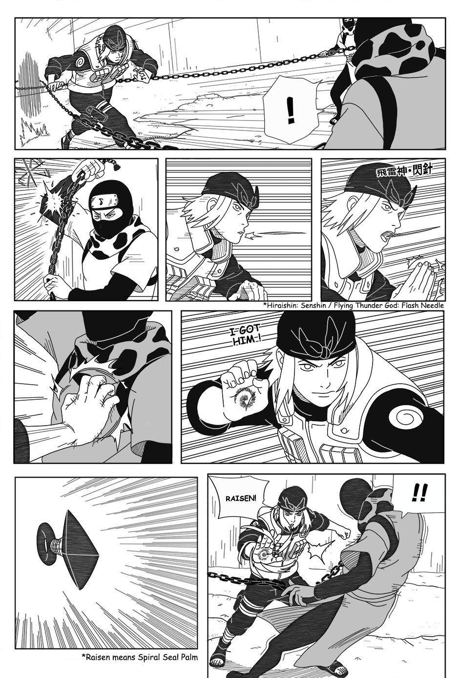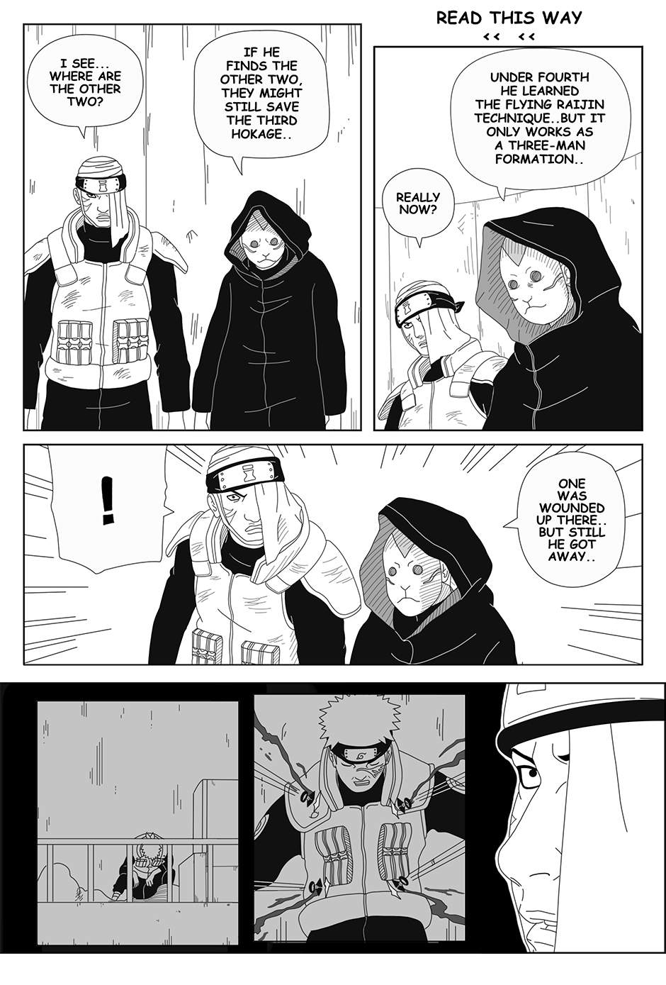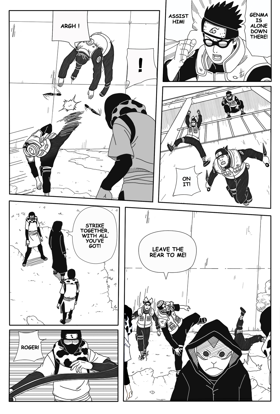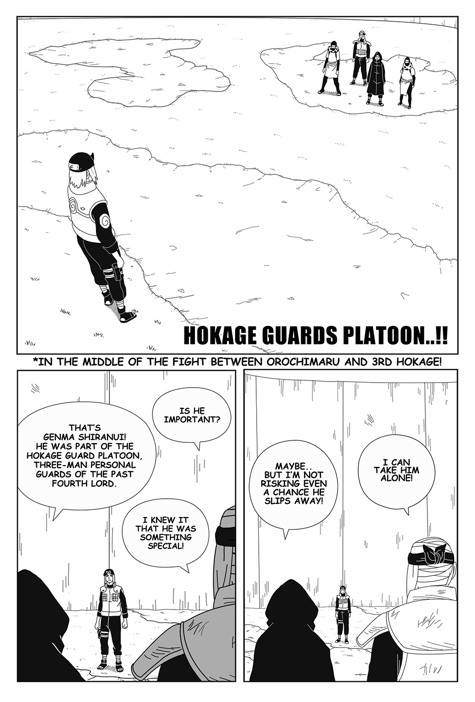 As Genma fights alone, his comrades Raido and Iwashi struggle elsewhere in the arena, injured and separated. With a forbidden technique about to be unleashed, the Hokage Guard Platoon faces its darkest hour.