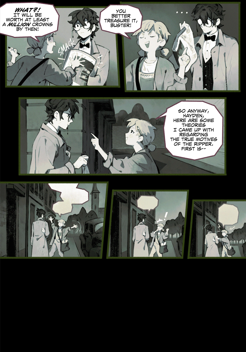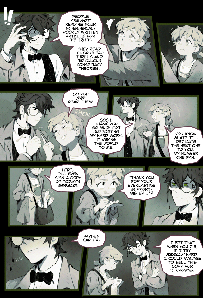 HAYDEN’S NOTES is a magic realism mystery with horror elements, set in the fictional country in the first half of the 20th century. The comic’s told in the non-chronological order revolving around Hayden Carter, immortal (by accident) gray mage, pursuer of knowledge and a witty nuisance for everyone around.