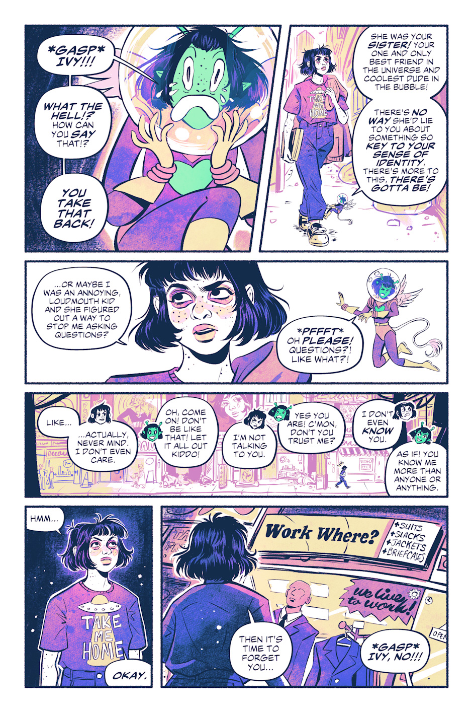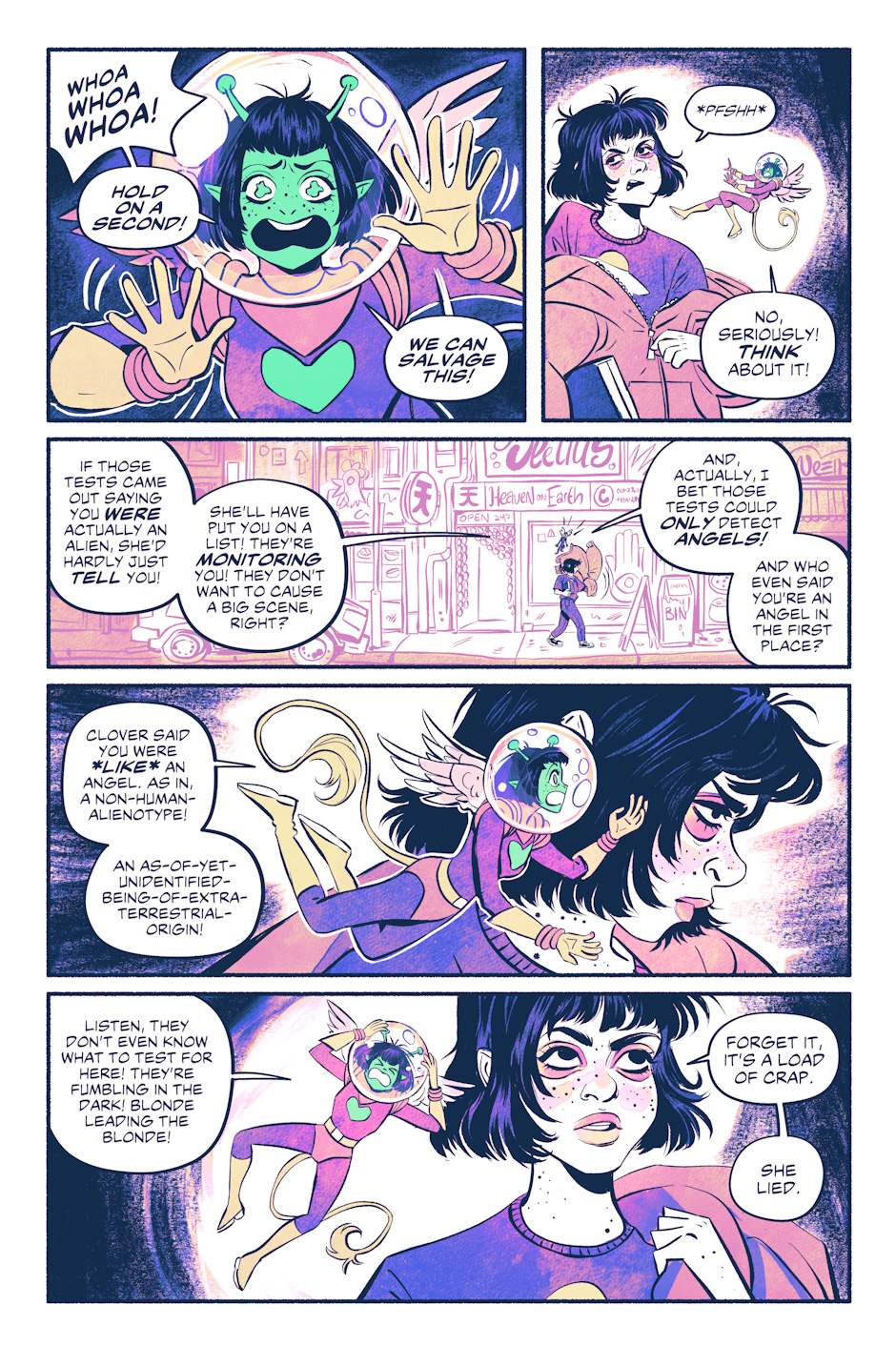 In the distant future, Earth as we know it has crumbled, destroyed and now dominated by mysterious monsters called 'angels'. Safe and sound inside a shielded bubble city, one scruffy queer girl with delusions of heroism stumbles her way through life as a loner. Now that she's found a brand new best friend, life can only get better... right?