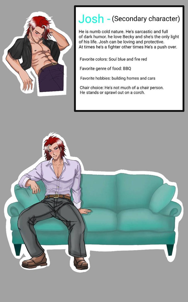 I wanted to show case each character based off there personality by a chair of there choice and how they would sit. This is 4 of 8. Josh