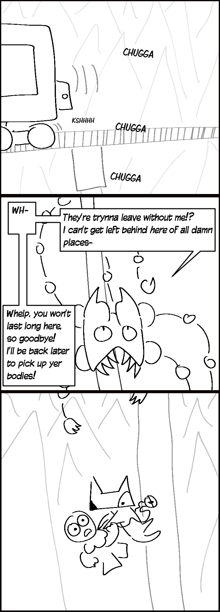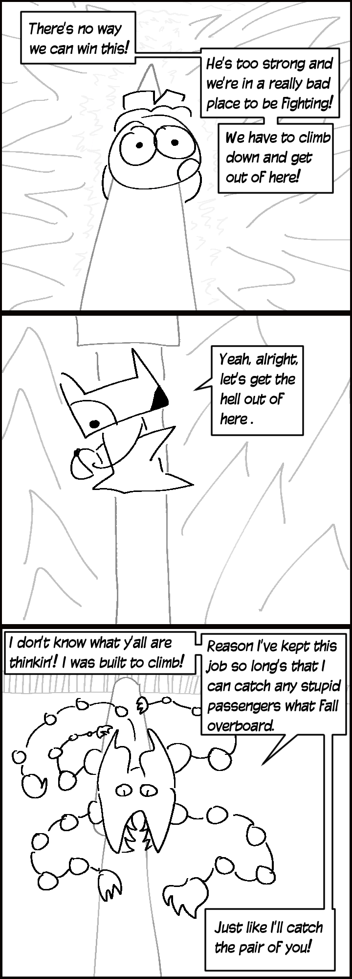 Also, an update: The next episode will likely take a while, as my motivation to continue updating Tapas has dropped off pretty steeply. I will still try to upload the comic to Tumblr, and if I decide to resume Tapas uploads they will be on a weekly basis.