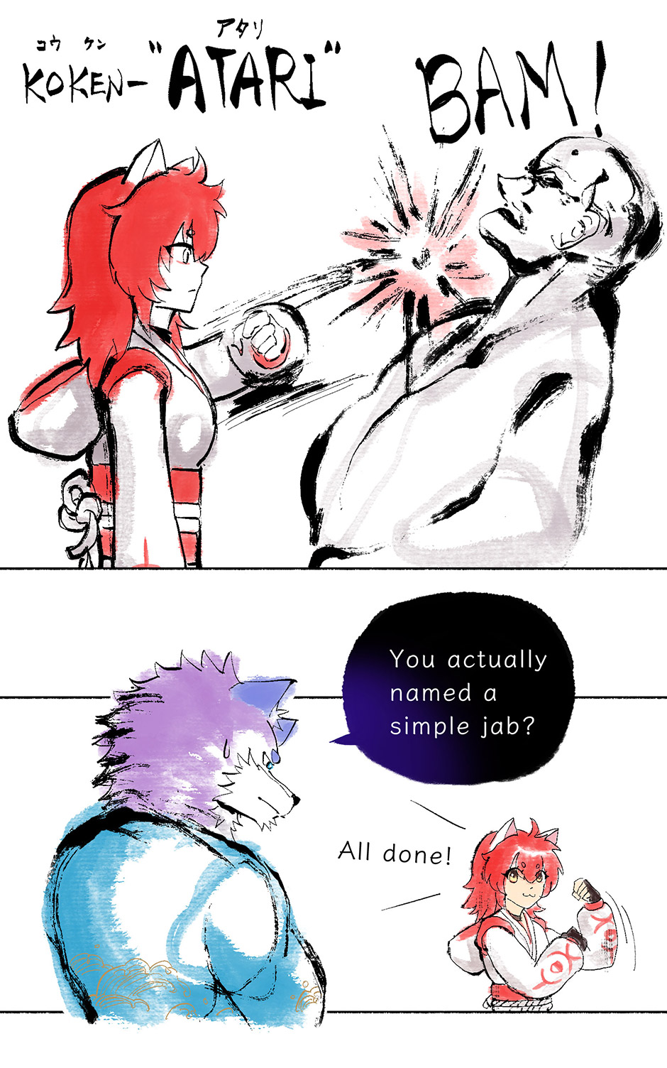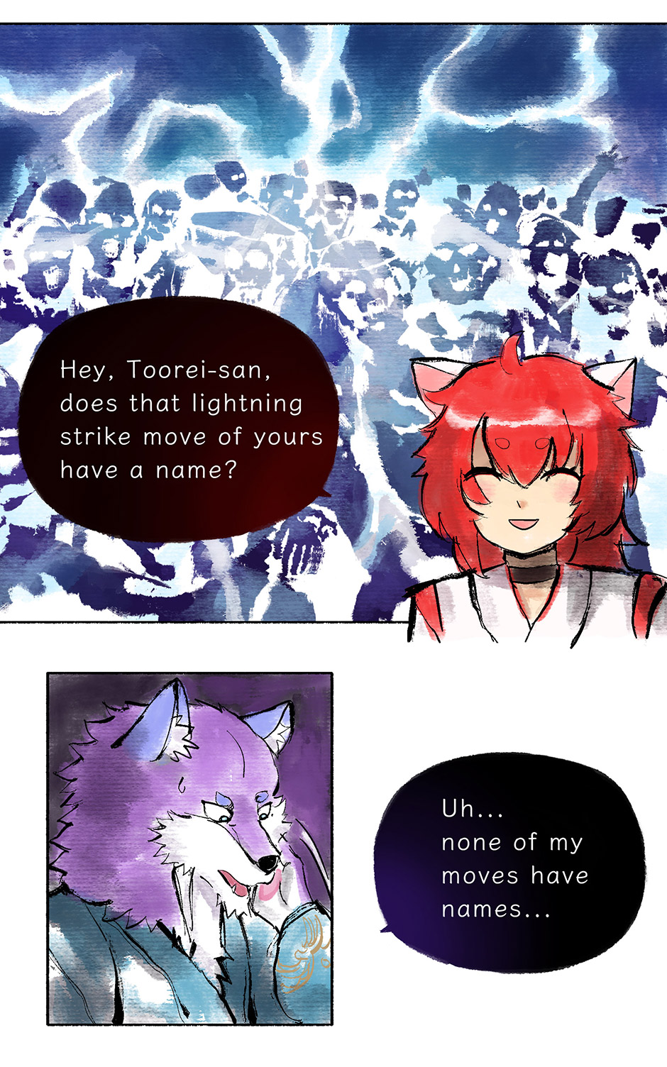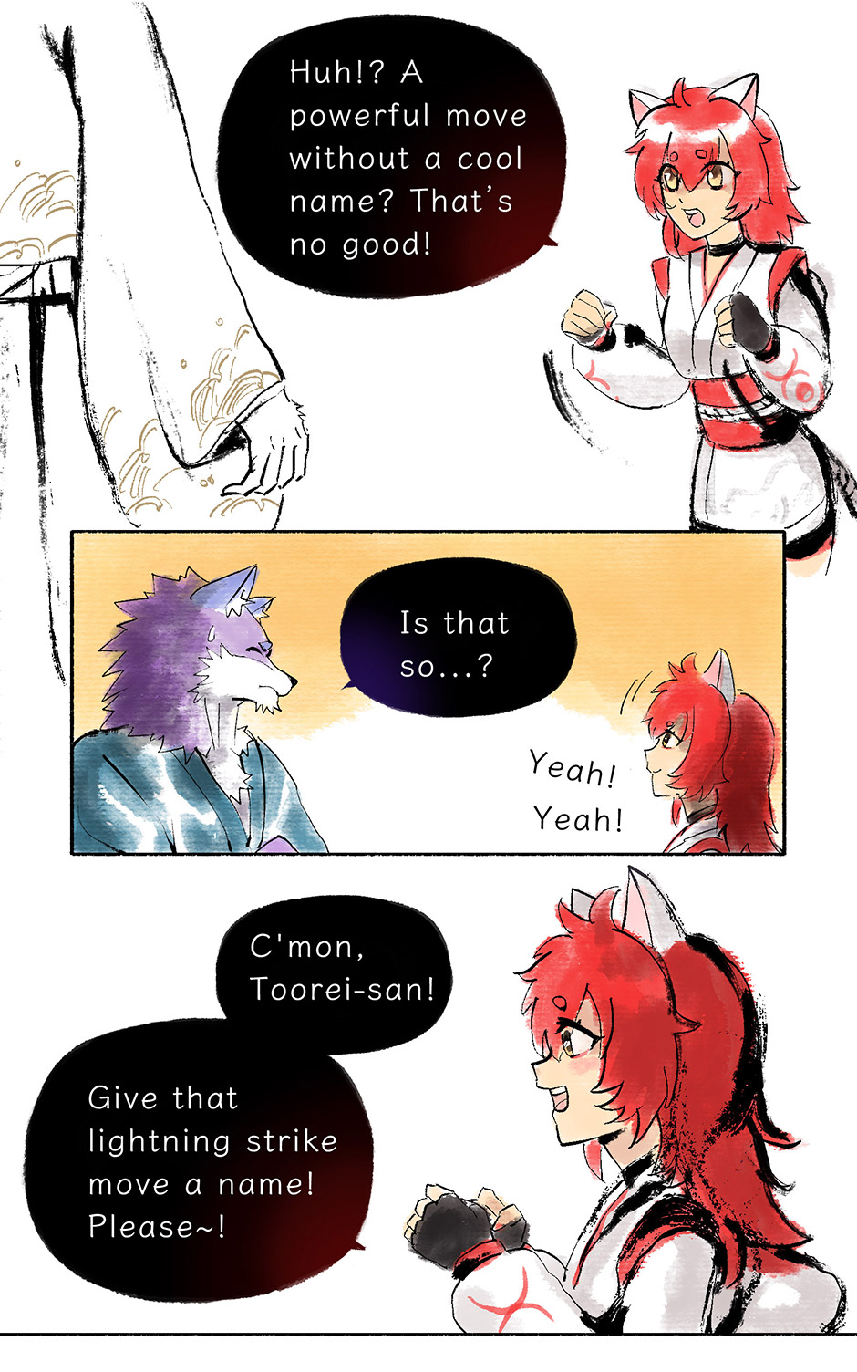 In this episode, you can see that Nekoto is completely unlike Toorei's composure - like a child, giving moves some very chuunibyou-style names. I really like this contrast between the two of them.