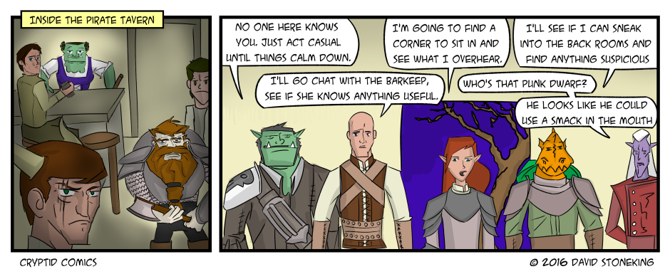 However, I am really happy with how Rumscum (the orc) and Dramatis (dragonborn) turned out. This was the comic where I first finally made character style sheets that I’d be able to reference in the future (Instead of doing everything by memory). Although they still have a long way to go before they reach their final form.