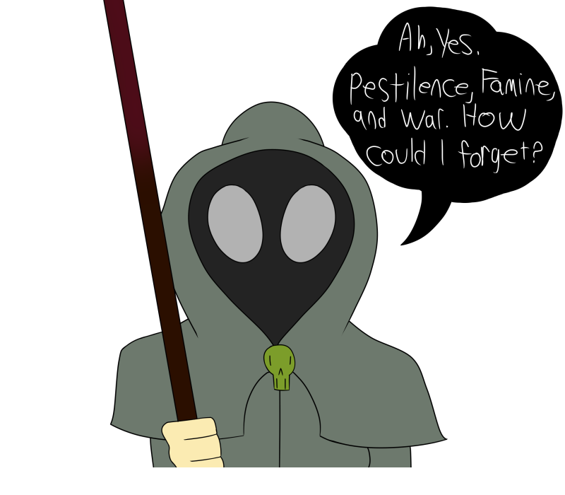 It's been hundreds of years since the Battle of Armageddon, fought between the angels, demons and Humans, of course conducted by the Four Horsemen of the Apocalypse. So what are these four terrible beings up to these days while the former folk adjust to the aftermath of it all? Surely something idiotic.
