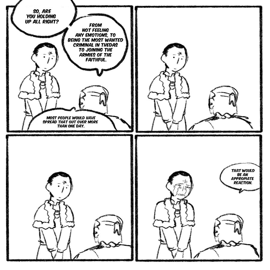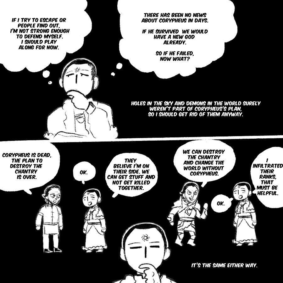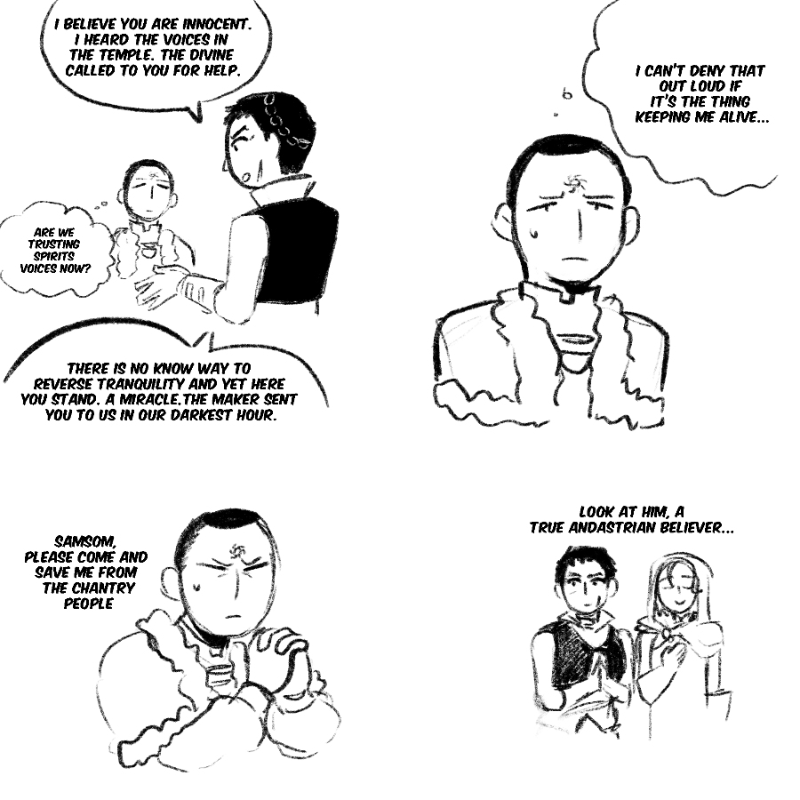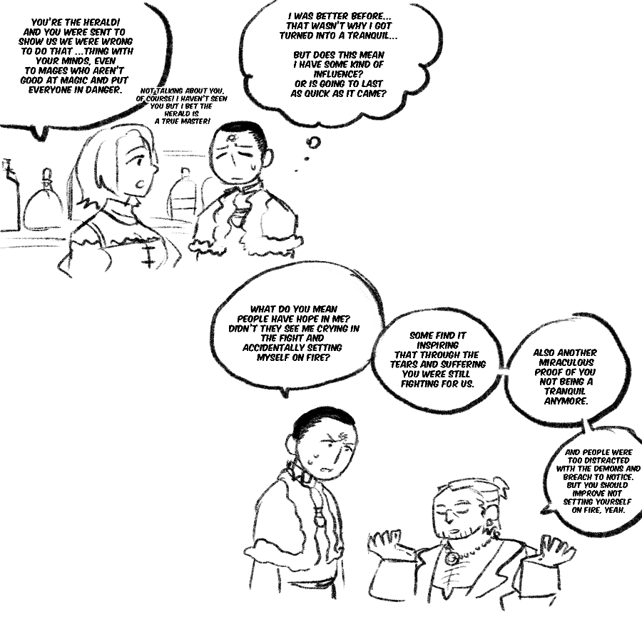 A comic exploring tranquility and its cure in the world of dragon age, but also the relationship of Maddox and Samson and him with everyone in the inquisition.