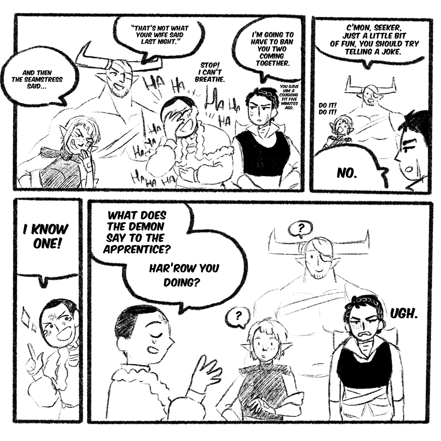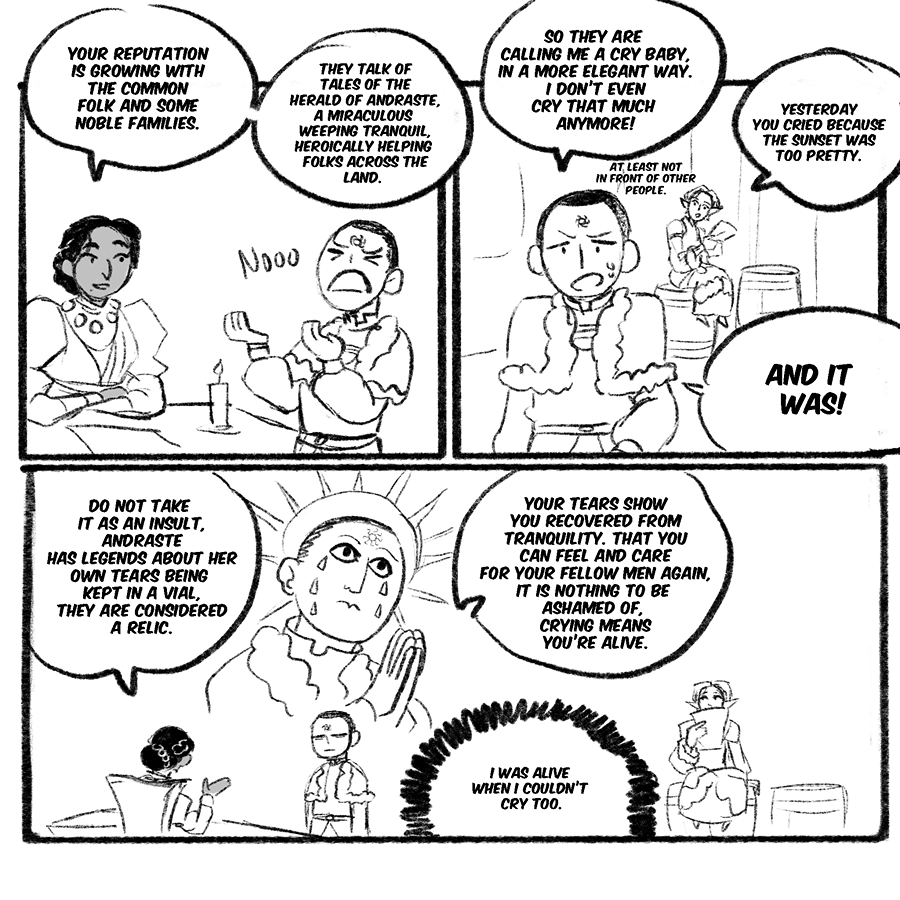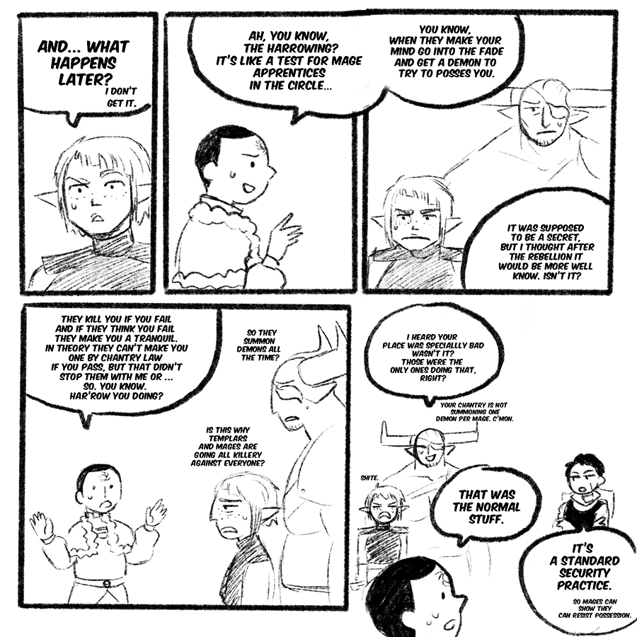 A comic exploring tranquility and its cure in the world of dragon age, but also the relationship of Maddox and Samson and him with everyone in the inquisition.