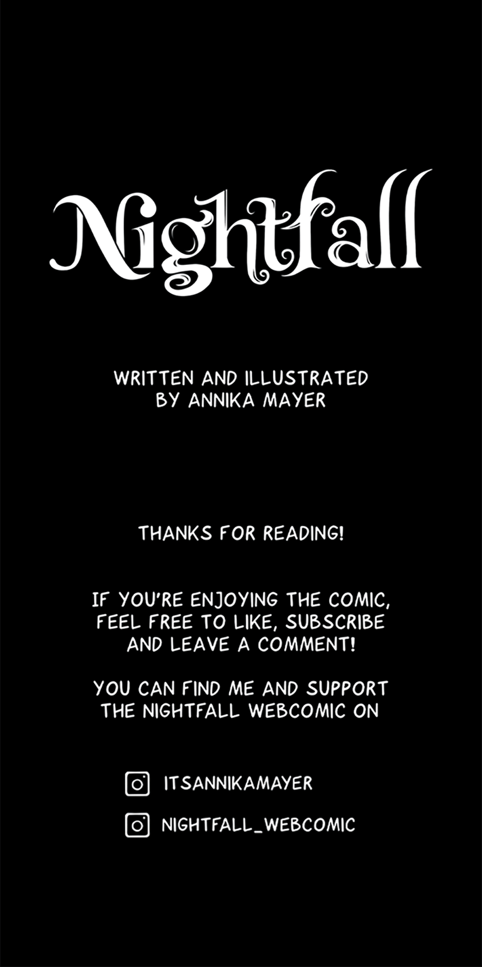 I hope you liked the prologue to Nightfall! This is my first time ever posting a comic to tapas and I'm so excited! I always love hearing thoughts on this story, so please don't shy away to tell me!! Nightfall is my passion project, and I put a lot of my heart and soul into this. Nightfall will update every Friday until we've watched up to where we currently are in the story on Webtoon and after that I'll probably have to ditch sticking to a schedule and post whenever an episode is ready, but I'll update you once we're there!! 🦇 I'm so excited for Nightfall to be now on tapas as well and I really hope you'll like it!