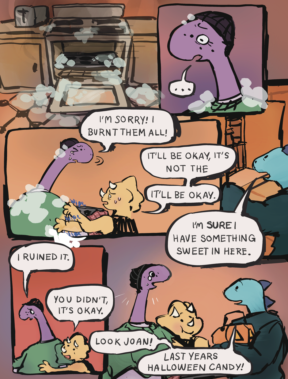 Roughly 66 million years ago, the dinosaurs knew the asteroid was coming. The end was near, and that truth was overwhelming; however one majungasaurus, triceratops, and brontosaurus still seek comfort in their last moments from one another. A mini comic about the vital importance of friendship, wether it be future, present, or prehistoric.