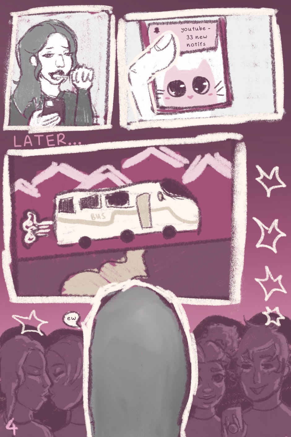 and so it continues… i wonder why shes getting all those notifications ?? btw the ✨ love interest ✨ appears next page so yayyy :P also. Getting into my groove. So pages may not all look the same colour wise etc. hope its still readable enough :D