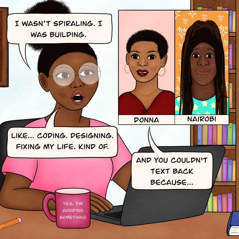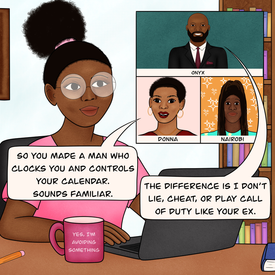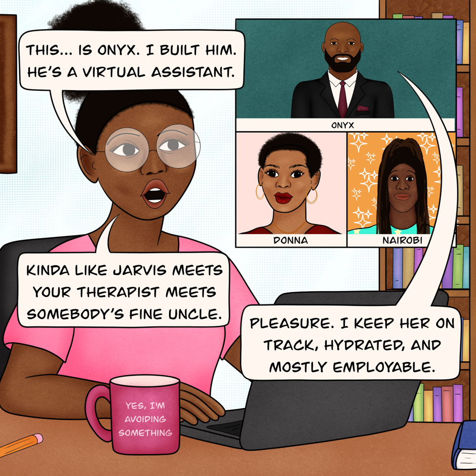 Desperate for structure, Queen builds a digital assistant named Onyx to help keep her on track. He’s smart, efficient, and comes with a little too much personality. Now she’s stuck with a screen that talks back, corrects her calendar, and occasionally reminds her to eat. He’s not wrong… he’s just loud about it.