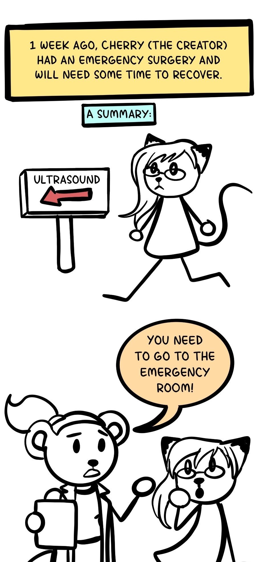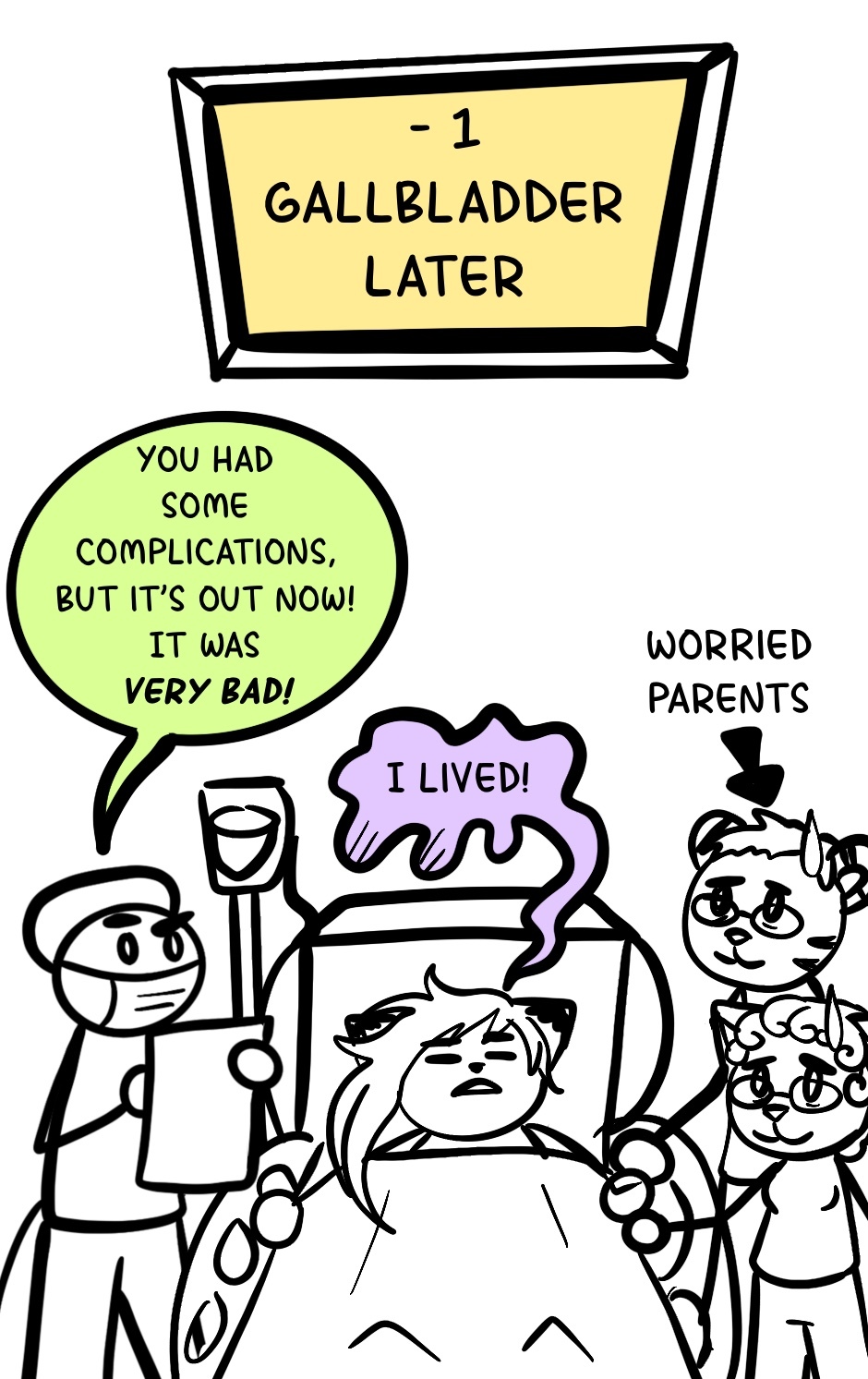 I had an emergency gallbladder removal last week, so no comics for a while. Sorry about that.